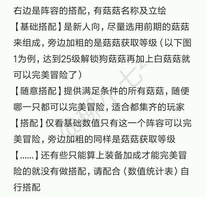 注意:攻略内所有统计基于每项属性的〈初始数值〉,不含装备加成。因此初始数值无法满足冒险条件的菇菇将不会列出来,甚至有些冒险就没有搭配,这个还请对照数值统计表制作装备后自行搭配
