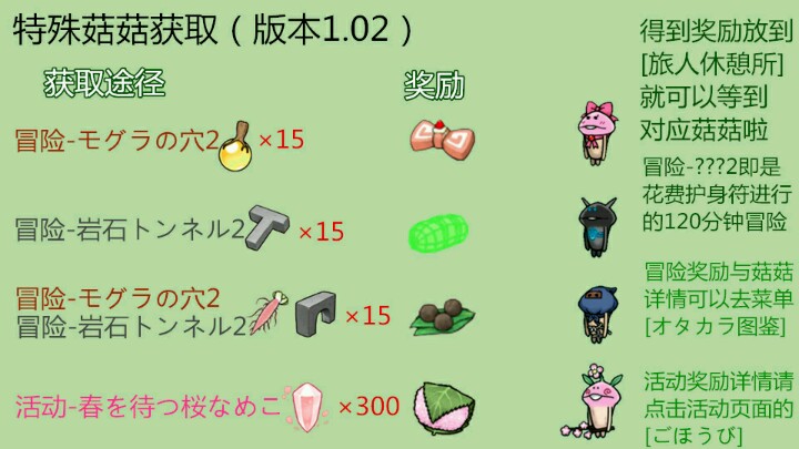 本帖内容:版本1.0.2包含的所有菇菇数值统计表&活动[春を待つなめこ]攻略&所有洞穴冒险攻略