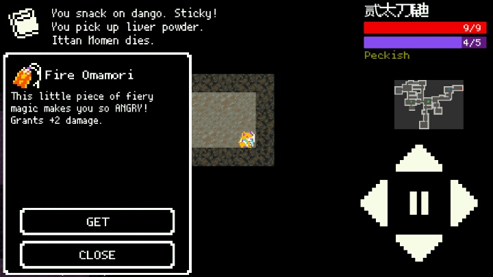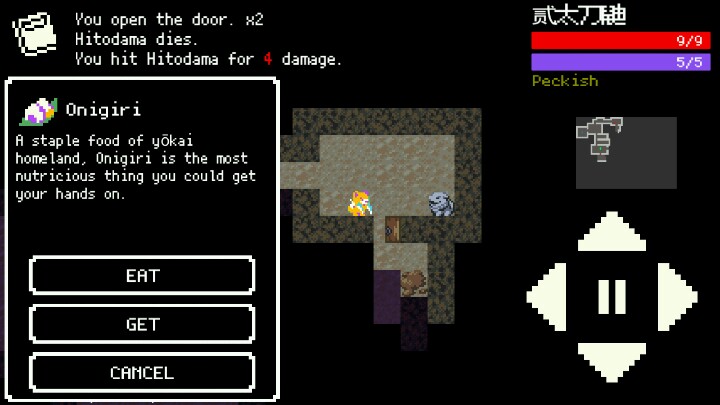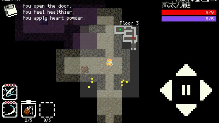 2)肚子饿是个问题,(妖怪也会肚子饿——,而且会锇死,死得很快,走一格扣一血,基本上死定了。所以探索整个地图的每一个角落,看看有没有东西吃。团子能回三血,但是不饱;豆腐加一防,建议吃这个顶一顶肚;还有个就是饭团,为填饱肚子而生(不回血),,是比较少见的道具