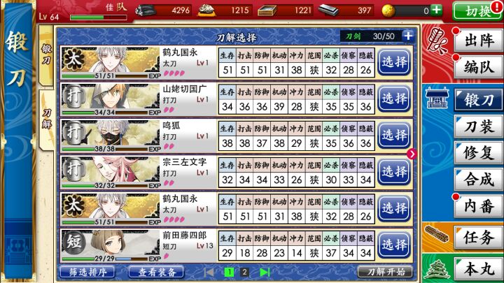 决定转那个all950公式了,之前比较长一段时间一直用的55,66,66,55,一点用都没有,一直出三花,二花的,从开始玩到现在只锻出过两把四花,还都是莺丸……江雪,一期都是厚樫山捞的,过分的不友好了