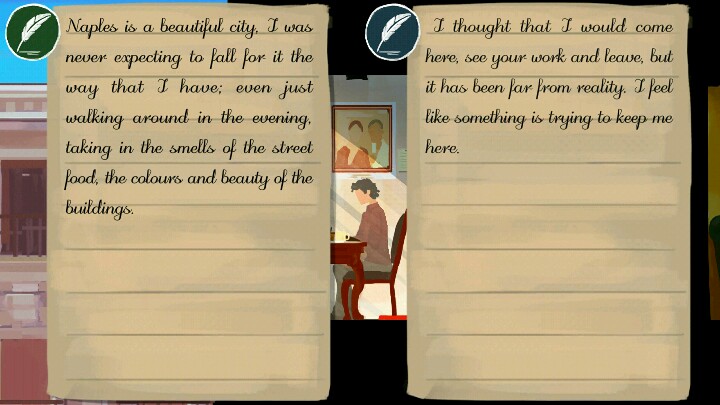 游戏流程虽短,但丝毫不影响内容的广度与深度。游戏共分为一条主线与三条支线,主线为儿子迈克尔在甚少谋面的父亲去世后来到其生前工作的地方小住,在了解并认同父亲工作的意义后解开心结。作为艺术工作者的他每天都会参观父亲参与设计的博物馆,并在面对艺术品产生灵感,神思游离,由此引出支线。支线①讲述了庞贝末日前夕,一位丈夫做出抉择,挽救家庭的故事。而支线②与支线③交织在一起,讲述了一对前世相濡以沫的恩爱夫妇在今生如何浪漫邂逅(一位是迈克尔,一位是游客)。