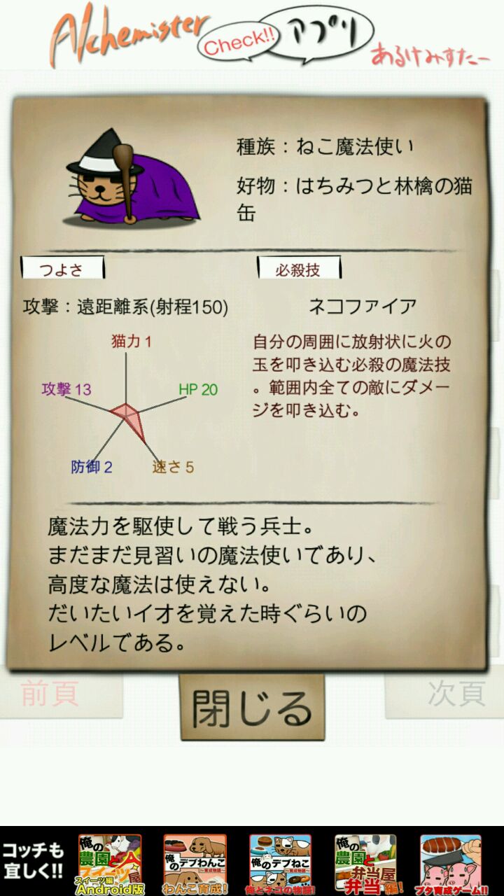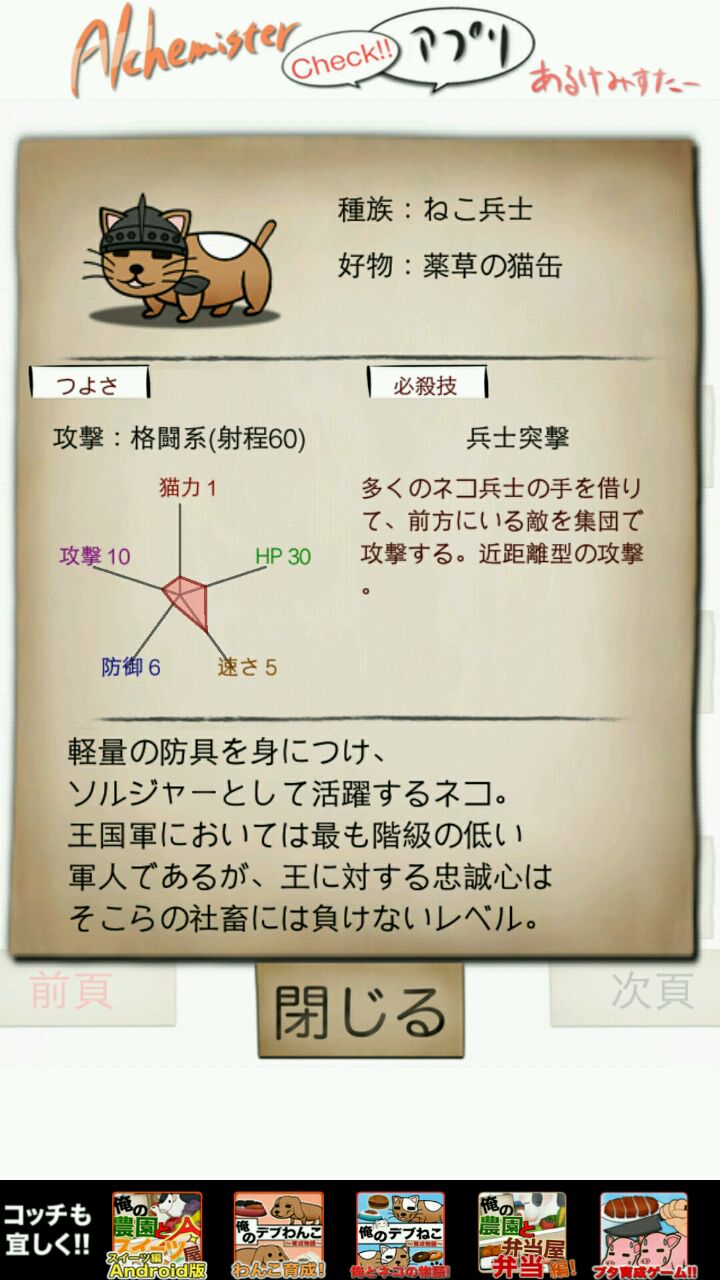 我会在下面放上士兵的信息。近战类分为肉盾和格斗家的样子(这都是自己起名的)肉盾速度较低,血量厚,但是必杀技相对强。格斗家们速度很快,可以冲到前线控制战局,一般必杀技范围都相对广一点。射击类特点是只能攻击直线的敌人,遇上魔法师是最危险的,基本就会毫无还手之力,但是普通攻击比魔法师高一些,在能把握战局的时候设置射击类猫咪吧。远距离系,也就是魔法师们,特点是全方位普通攻击,建议在设置队伍的时候放在一和四的位置,节省移动的时间。但是血量很薄,防御也不高,所以请务必不要派他们去前线,位置处理的好可以轻松打败近战类和射击类。必杀技一般都是广域的,当然也有例外,请注意信息。