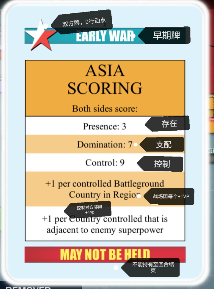 上篇讲到了「稳定度」这个概念,现在我们放大版图再看一遍,我选择的是亚洲这个区域(配合下述亚洲计分牌),中国是牌,不容易被操作,所以没有中国。