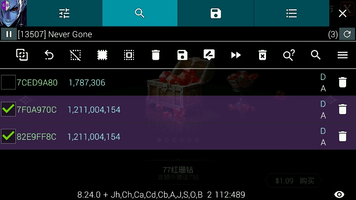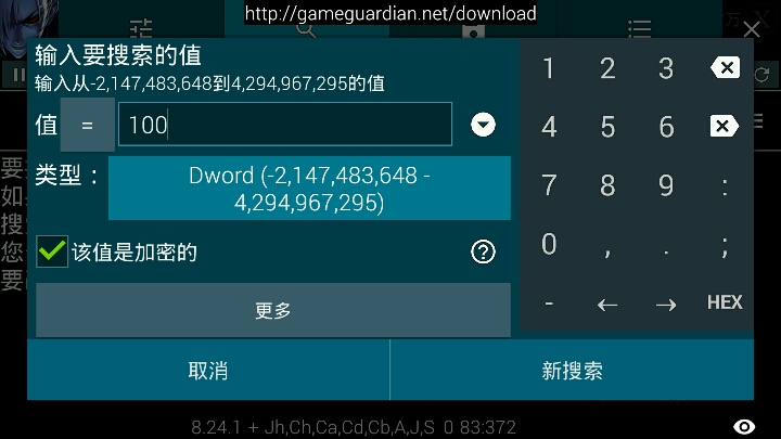 以初始100钻石为例, 点击问号,勾选加密搜索100 ,选择DWORD数值类型 然后购买20钻石的金币,搜索80, 【退出商店再回到商店,继续搜索80 】 然后再买一次20或者35的金币后搜索钻石数字 最后列表出现2个12xxxxxxxx(亿)的数字 选中改大点 不要改太大 会爆