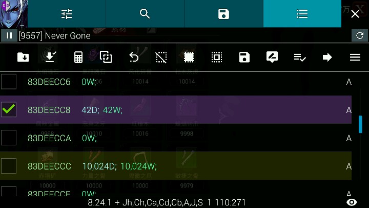 首先搜索背包里一个不要东西。。比如商店能买到的那三种石头, 反复卖出买进 确认出唯一数量结果后,长按结果【跳转到该地址】 然后如图修改上面那个数字,如果你改的是石头那么应该是40~42,改成76,这个是尾巴的物品代码。。。然后回去再卖一个就能自动存档了