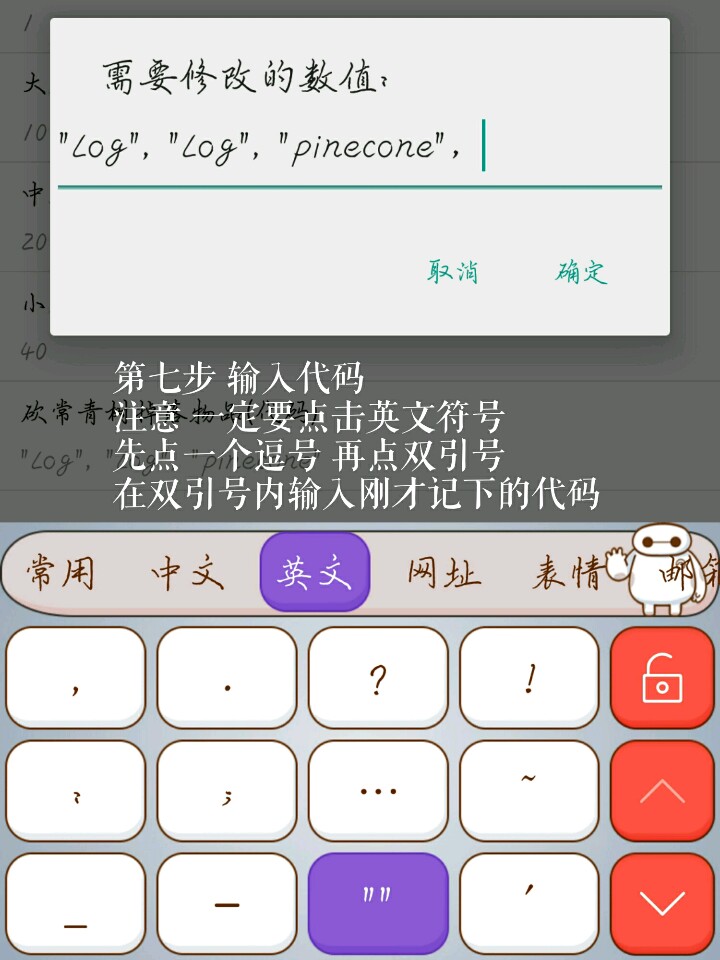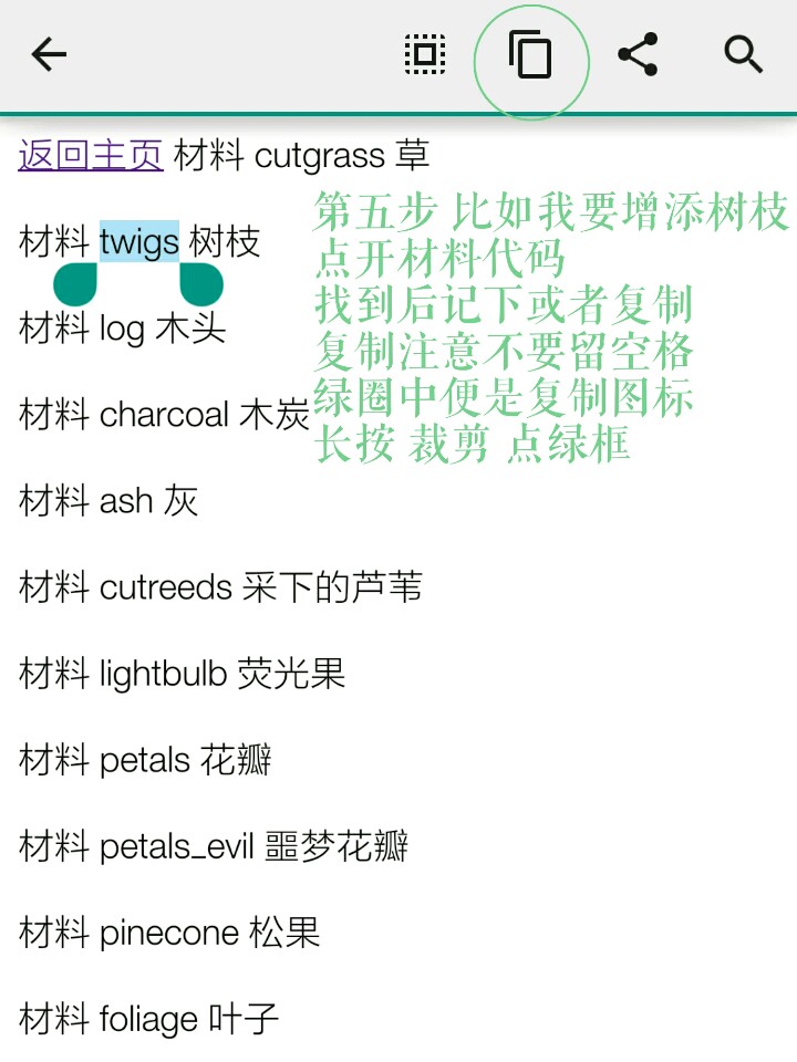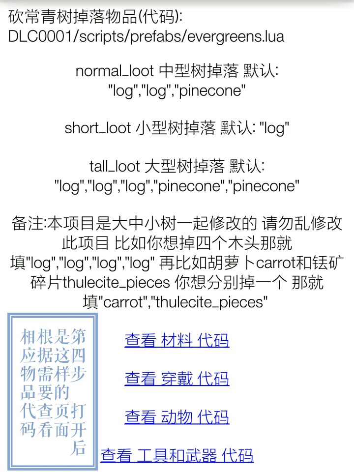 调整砍树掉落物品 这个最屌 但是也最需要注意了 请一定点击右上角【···】打开帮助关于查看代码 复制代码 并且仔细阅读修改说明 大概就是按照【"掉落物代码", "掉落物代码", 】的格式填写,""中一定要填写正确的物品代码,格式也一定要正确!同种物品 需要多少个就要按格式填多少次 至于最多可以填写多少个掉落物品,我不太清楚嘿嘿~