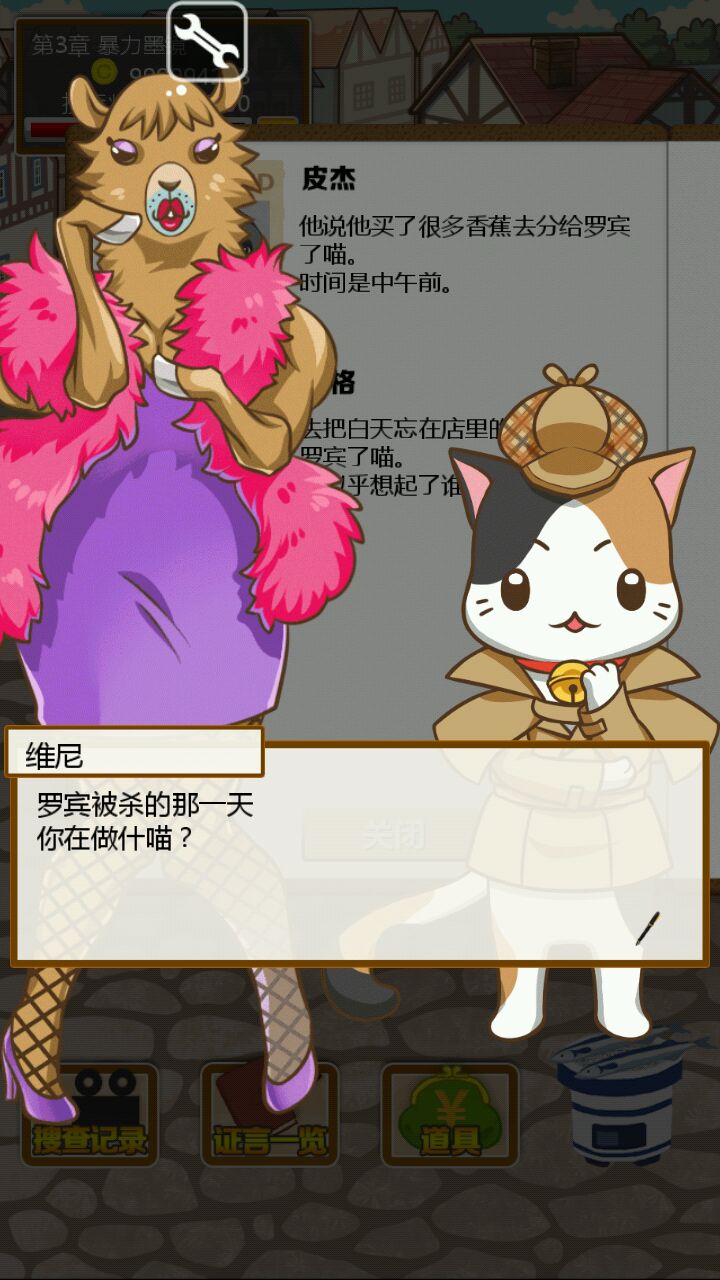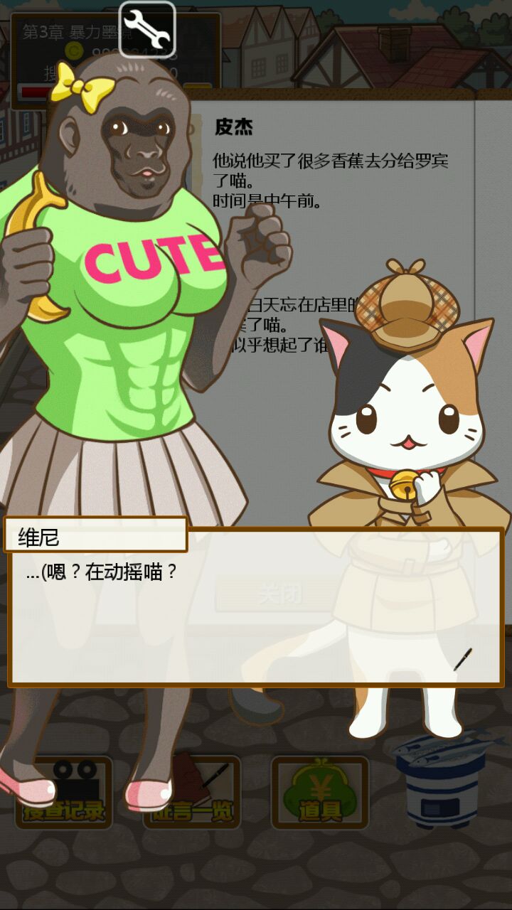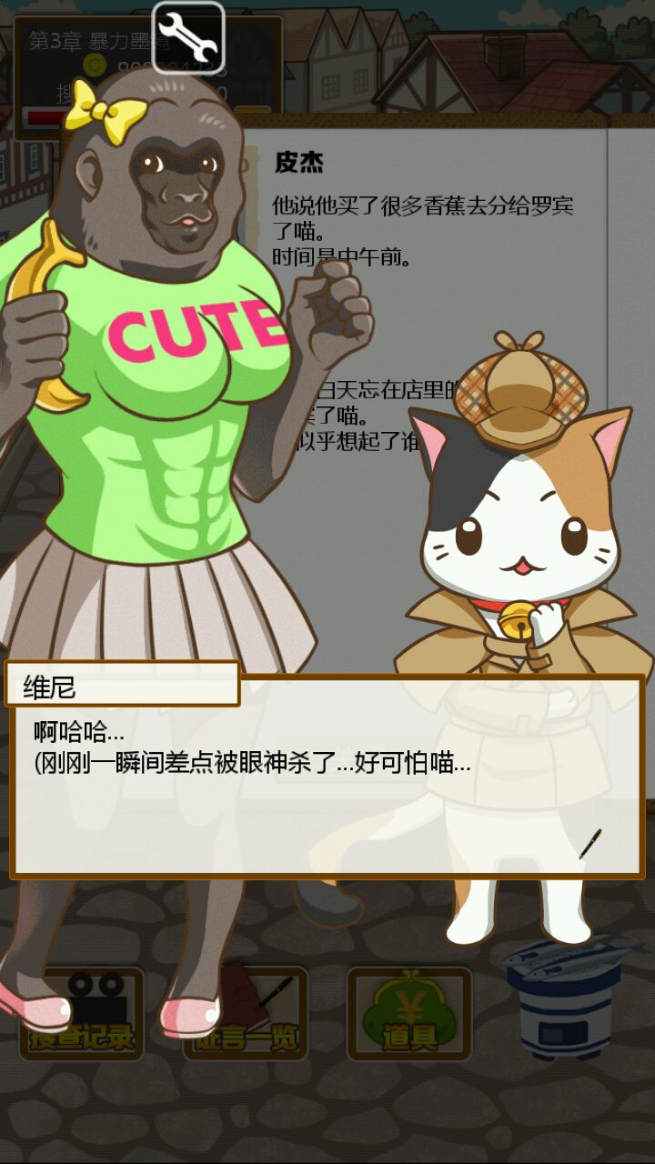 首先我们的小猫维尼想吃蜂蜜可是回到家却发现主人躺在血泊中!为了抓出杀害主人的凶手,我们的小猫维尼化身福尔摩斯喵励志开启了他的寻凶取证之旅( ̄∇ ̄)首先取证现场看起来有不少疑点,主人临终写下的宝贵信息暗示着瑞比狼小姐可能是凶手,尸体旁边掉着鹿毛,窗户上有着驴踢印,地毯上有香蕉皮,金库是没有动过的这也证明了要抓凶手真的很困难,orz=皿=,(而且我指证狼小姐是凶手结果错了)重新来了一遍=皿=