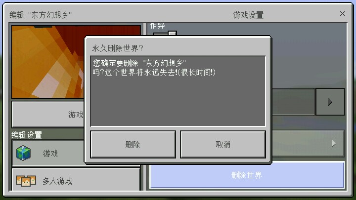 我来解释一下这张地图是用touhoucraft东方幻想乡服务器电脑版存档转换的手机存档 用MCEdit和WorldToPE一起转换的 但是因为高度限制损坏了很多地方 所以我和10个好朋友约定把存档修好 不过渐渐的她们都放弃了 就只有俩个朋友在帮我 他走了以后我那个朋友也放弃了就剩我一个了 现在touhoucraft服务器的服务器关闭了 我也没有必要修复了 我主要是通知一下他 现在地图修复了80% 我也不想干了 因为版权问题 也可以说多玩盒子 存档已经删除了