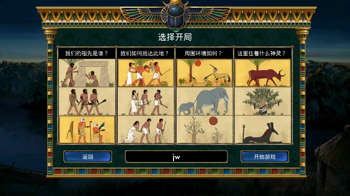 首先游戏刚开始分为三种模式,对新人较友好的模式,遵从史实模式,挑战模式。一进去的画面一般还能接受,然后教程什么的你懂的,左边是任务,右边是事件,右下角分别是小地图,大地图,祭祀,研究,建造,上面的是资源,分别是工人,食物,生产,军队,文化,权威。工人是前期很重要的,负责探索、采集、向别的部落派出使者、在没有军队前可以跟别的部落撕逼,打败别的部落后会消失(这厉害的,一个人灭团)。食物会影响工人数量,文化可以研究科技,军队要研究完简易兵营才可以使用,权威是祭祀必须的。 接下来特别是建造跟科技挂勾,而且必须建完前面才能建后面的。部落和地图,需要探索发现部落,在新手模式里的小地图,你不用管,它都会消失(不知道其他模式会不会这样,稍后补充),攻占成功后可以减少别的部落进攻率10%,等你探索完小地图,解锁大地图后差不多解锁了暴动率,河流很容易探索。右边的事件你可以简单粗暴理解是BUFF,祭祀也可以理解成BUFF,事件的触发是关于年份,祭祀、环境的变化的。剩下的慢慢补充容我组织语言,图是打完后的结算,剩下的模式全解开了。