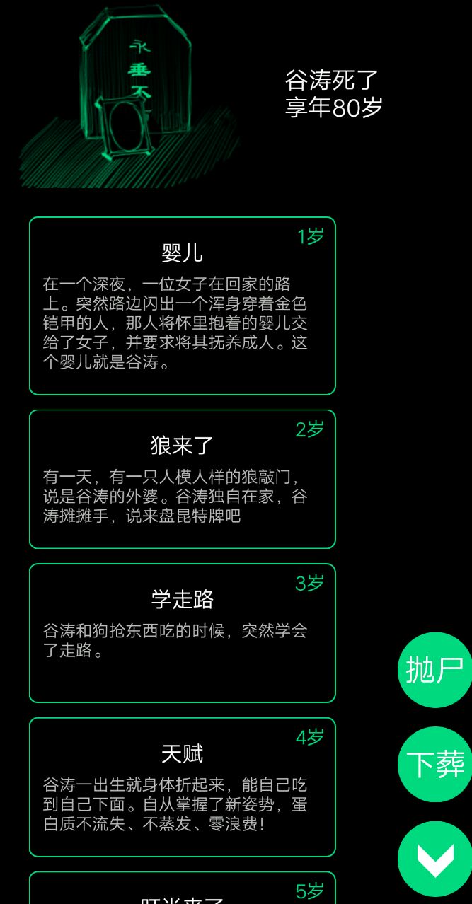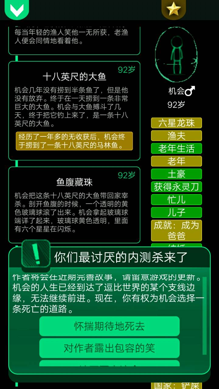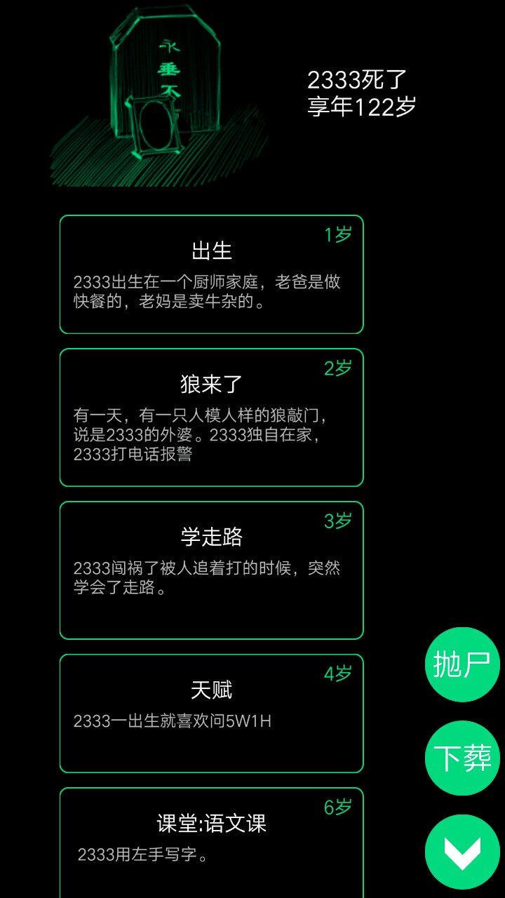 游戏开始,更新,没错,upgrading...然后点击新的人生,填名字性别,说真的,虽说是游戏设定,但每次死了都要重填确实麻烦。然后就是出生buff和debuff,如图出生就被加了个肛X的debuff,不然不至于英年早逝。。随后就是你自己自由选择的随机事件,游戏本身很简单,但会给玩家一种求胜感和自由感,一种你的人生你作主的愉悦舒畅。