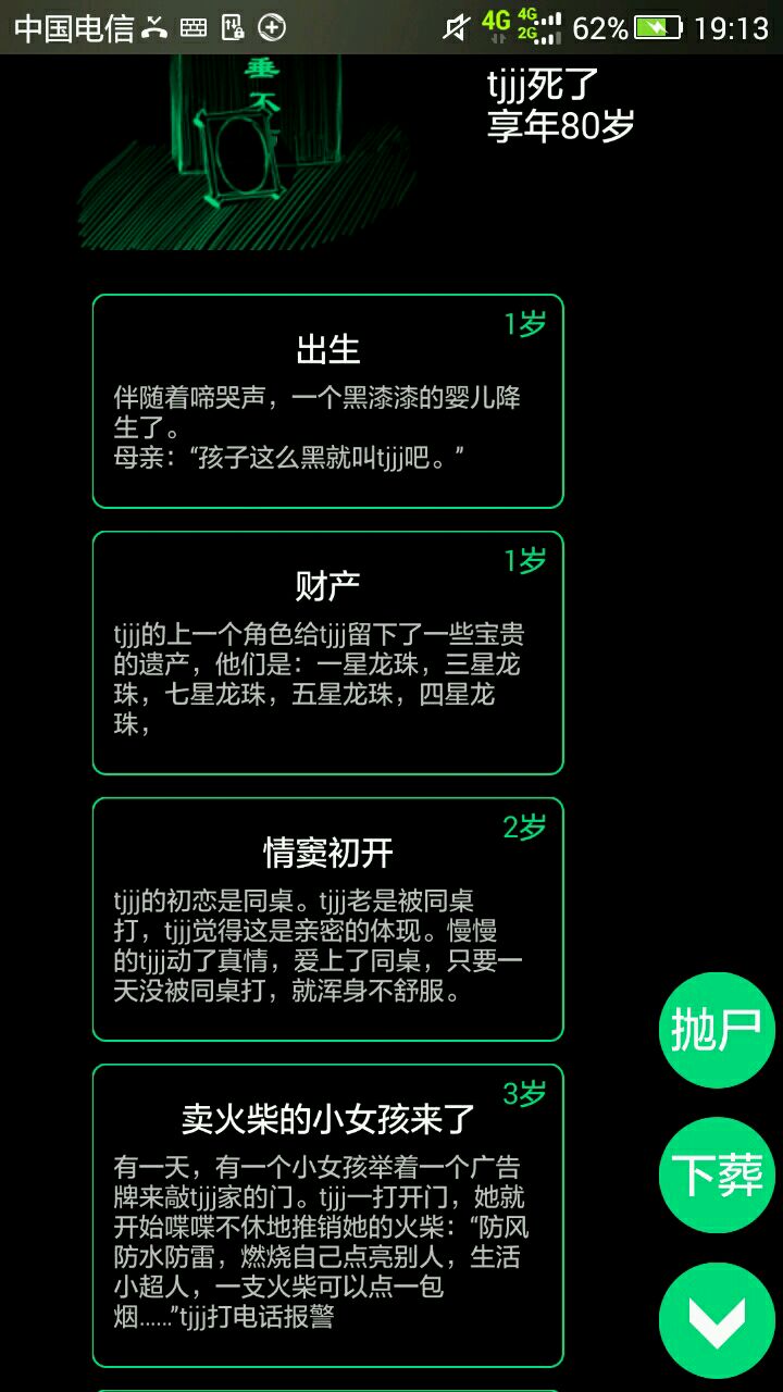游戏开始,更新,没错,upgrading...然后点击新的人生,填名字性别,说真的,虽说是游戏设定,但每次死了都要重填确实麻烦。然后就是出生buff和debuff,如图出生就被加了个肛X的debuff,不然不至于英年早逝。。随后就是你自己自由选择的随机事件,游戏本身很简单,但会给玩家一种求胜感和自由感,一种你的人生你作主的愉悦舒畅。