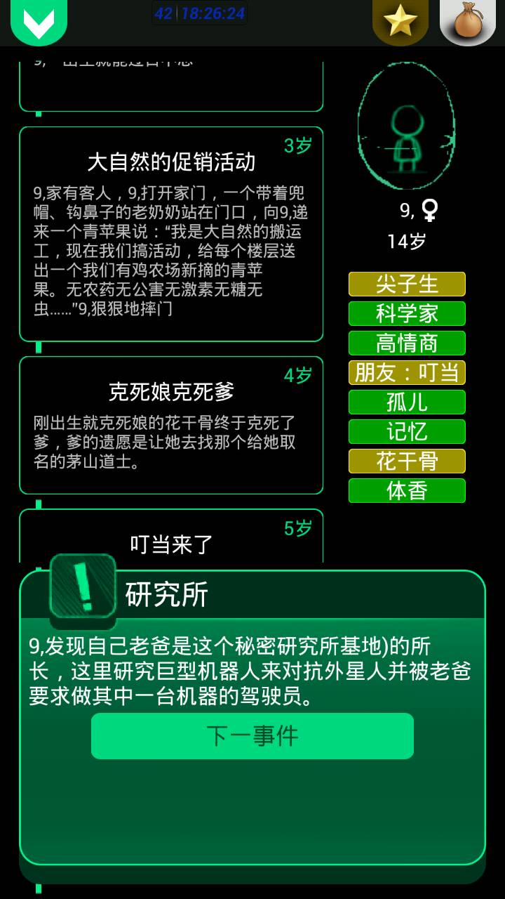 没错,只有8mb的容量,类似文字冒险游戏,从1岁开始,你的每个选择都会对未来有着或多或少的联系。怎么说呢,“逗比人生”这款游戏我在一年多前就接触过了,到现在回顾评论区依然冷清,以一个旁观者的角度来看,这款游戏确实算的上同类型精品,没有混、北浮记、商伙人等操作繁琐,但乐趣性依然丝毫不减。整个游戏你可以接触到许多不同的事件,如异世界、恋爱、学习、科学家、收集龙珠等,其中大多是网友真情奉献的,好吧,其中关于洛天依的恶搞事件最不能忍。