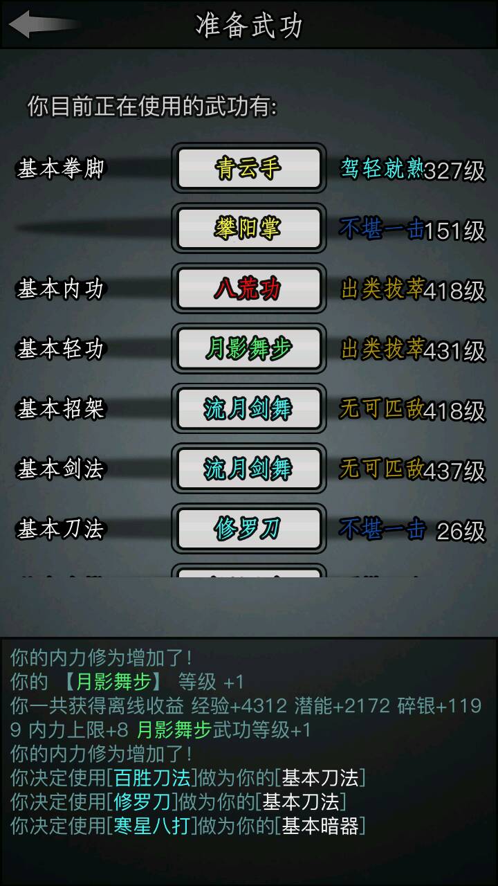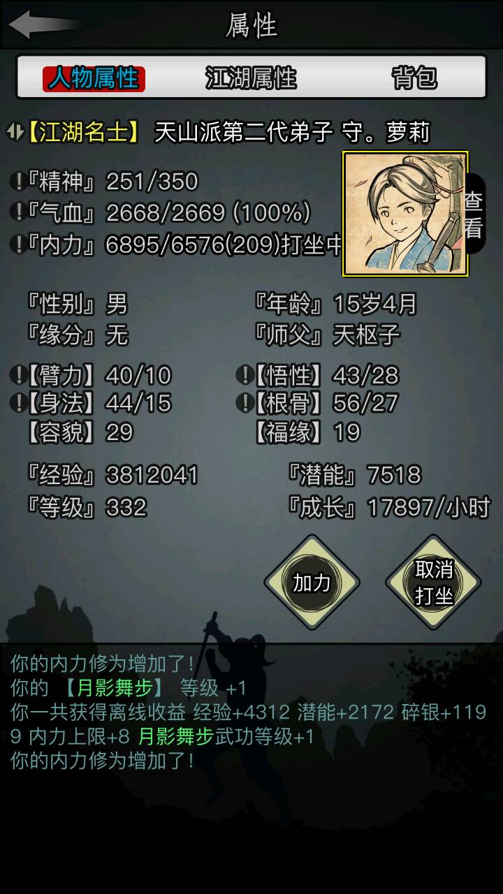 其实这种放置游戏挺简单的,基本可以不看攻略通关,(通关?长时间玩就好,至于10章往后后要用元宝解锁问题也不大,签到送元宝的,当然有等不及的小伙伴可以开个月卡),还有开始送的新手礼包俩分身卷轴别乱用,最好先用一个打坐把内力坐到800左右,前10章通关没问题,然后还有技能,先提升基础,再提升由基础衍生出来的技能(直接练功就好,只耗时间)。你10章通关以后再用那个卷轴一直打坐,(卷轴只要不手动停止是不会消失的),等到把解锁11-20章的元宝攒出后就能停止了。还有副本有很多隐藏彩蛋得自己找,如果实在找不到的小伙伴就看攻略咯。这游戏呢,和天天打波利差不多挂机就能升级,但可玩性比天天打波利高很多,打副本主要要注意剧情,要不你什么都不知道,没法玩。我也才玩了三天,自己总结的经验,大佬勿喷。下方有图,2楼继续补图。