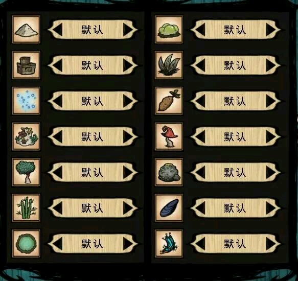 【岩石】设置岩石的多少。岩石用稿子凿开掉落小石头和硝石,硝石用来制作冰火和炸药。船难中的岩石多出一种类型,呈黑色,需要用铲子挖开----有可能会挖出岩浆口,不定时喷射火焰,有照明效果。
