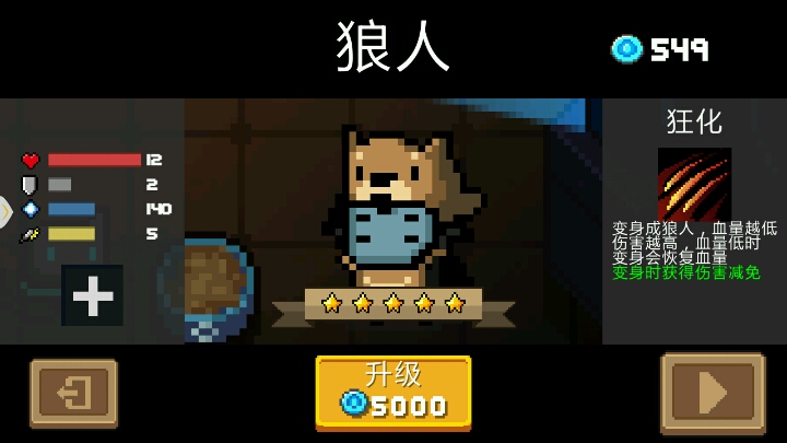 狼人的属性是11/1/120/5,后期是12/2/140/5,技能是变狼回血(后期是减免受到的伤害)。然后我就被坑了。我以为是变狼杀人回血,结果玩起来居然是半血下变身直接恢复到半血(后期是6滴,超过这个就不会加血了),哎呀麻痹好气哦。打小怪基本上是直接贴脸刀吊打,但打boss就很无奈,贴脸刀直接被boos干死。