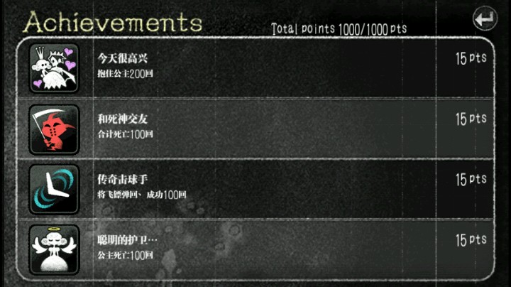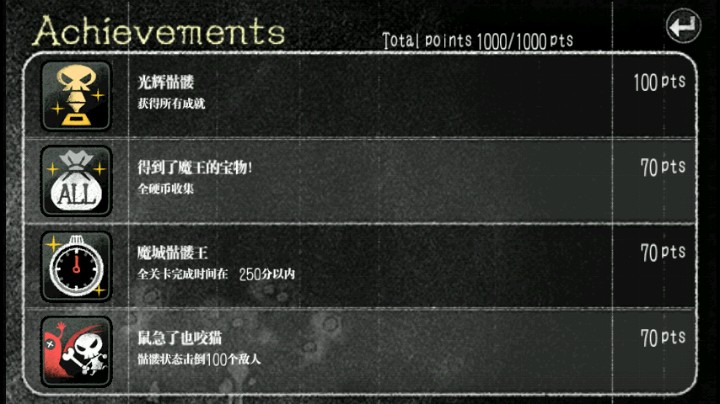 1.光辉骷髅除了这个成就获得下面所有的成就2.得到了魔王的宝物收集到所有金币3.魔城骷髅王游戏总时间在250分钟以内4.鼠急了也咬猫骷髅状态下打败100个敌人5.英雄诞生王子状态下打败100个敌人6.是神我都杀给你看Stage14 无伤连续通关7.蜡烛服务用红粉笔一次性引燃4个蜡烛8.被称作蜘蛛侠的人游戏总时间在350分钟以内9.我会飞从很高很高的地面上跳下来10.宝藏猎人收集到135枚金币11.这回在迷宫之中收集到120枚金币12.会发现什么宝物呢?收集到100枚金币13.迅速地通过了关卡Stage11-5 不被敌人传送并通关14.恭喜恭喜全Stage通过15.魔王?看样子意外富裕呢无伤打倒魔王16.见习骑士Stage1~4通关17.普通骑士Stage5~8通关18.孤高骑士Stage9~11通关19.老练骑士Stage12~15通关20.第一次获得宝物第一次收集到金币21.获得了宝物收集到10枚金币22.想做宝物收藏家收集到25枚金币23.再次获得了宝物收集到50枚金币24.能得到多少宝物?收集到75枚金币25.今天很高兴抱起公主100次26.和死神交友合计死亡100次27.???(本人暂未获得)28.聪明的护卫...公主死100次29.白粉笔的使用者第一次用白粉笔30.赤粉笔的使用者第一次用红粉笔31.青粉笔的使用者第一次用蓝粉笔然后....就没有然后了。如果有谁知道No.27是什么,可以在我的贴子下回复我。那我们下次有机会再见啦,Bye bye!