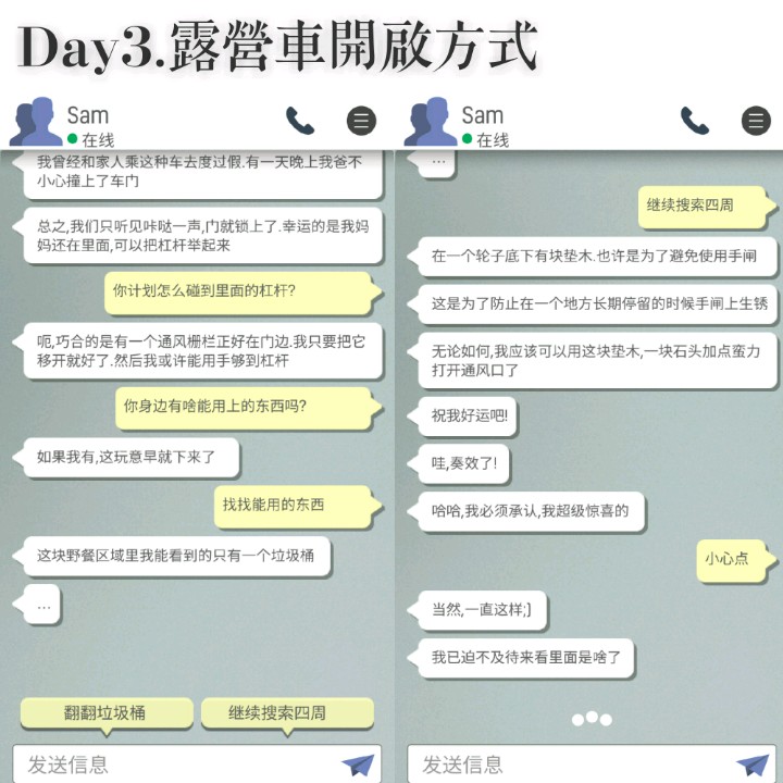 →去找路,會看到野餐營地裡的露營車,【找找能用的東西】後去【探索四周】就能成功進車裡(如圖),為了找鑰匙可搜索車子前面或後面,我選擇去【後面】找到一本日記本,在上頭查知了原來車胎已經出問題且這家人已經凶多吉少的狀況。