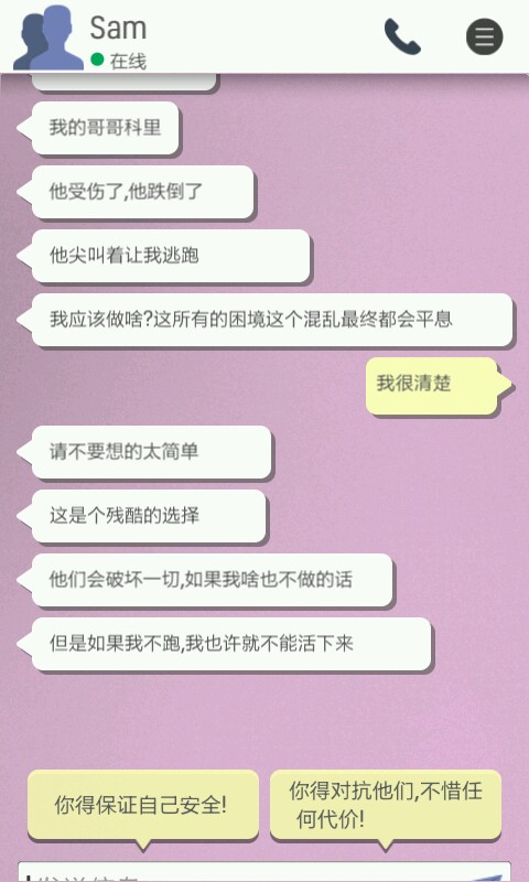 莫名地用手機連上了跟安娜一起出逃的Sam,在一間屋子中幫安娜包扎,但她意識不清的尖叫引來了喪屍以及詭異門響