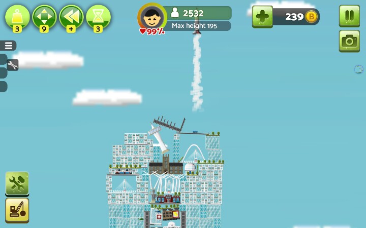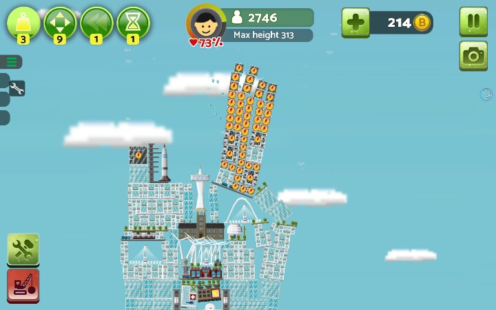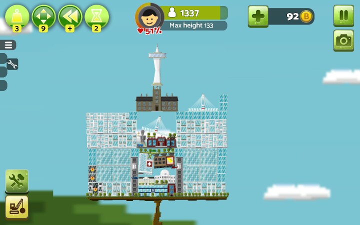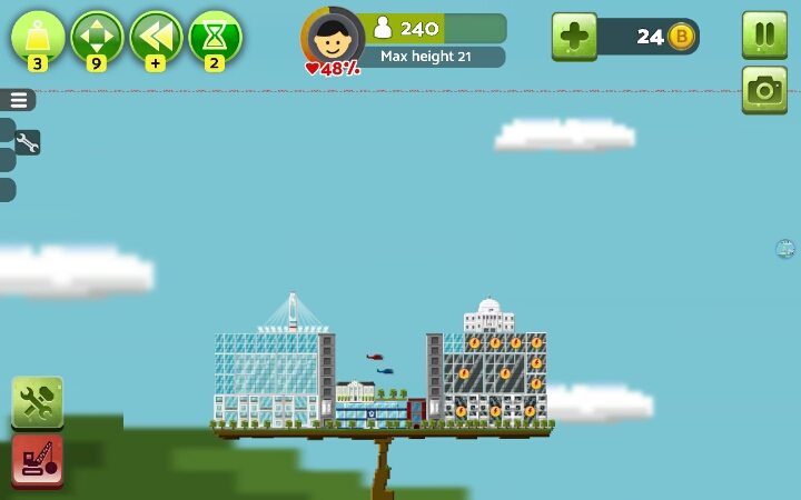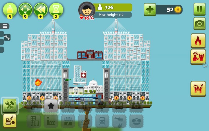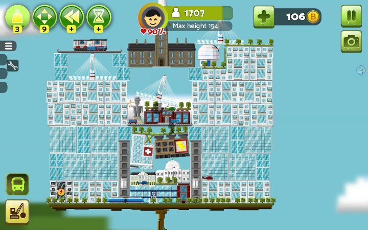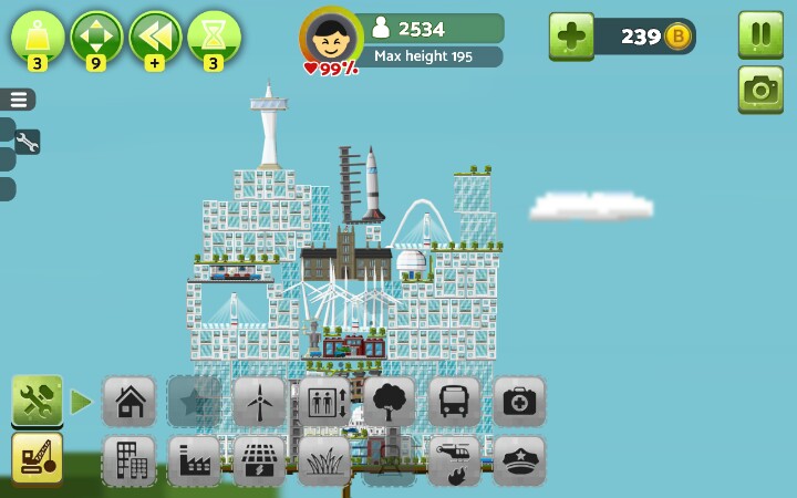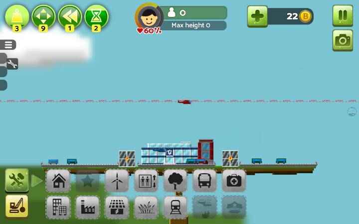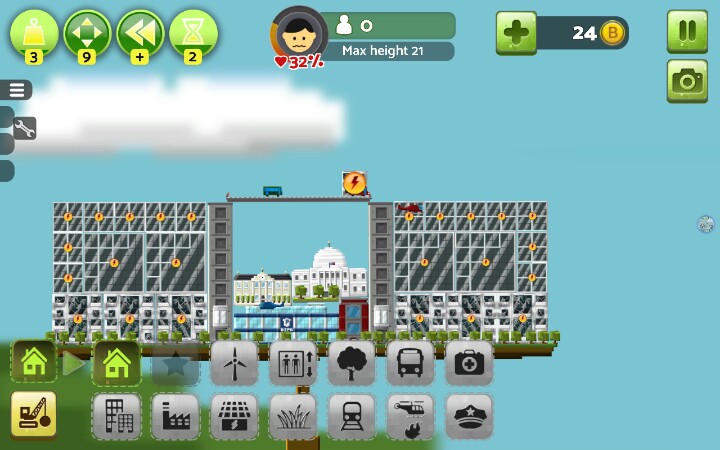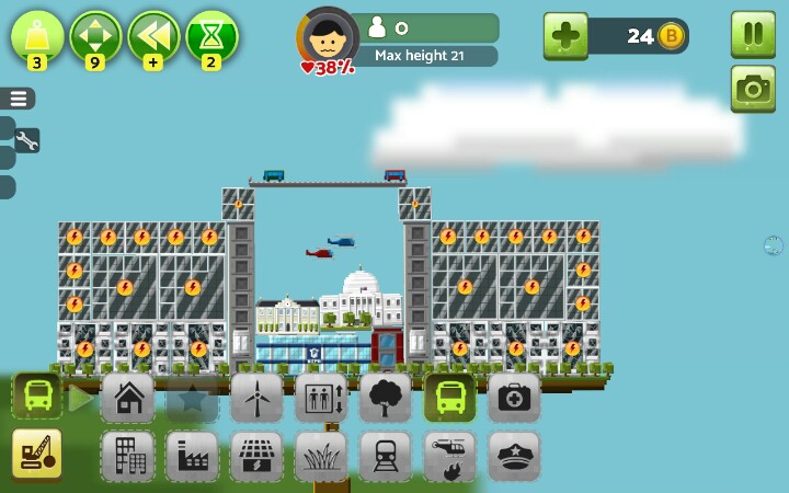 建议开始就把地面铺满小树,后期房顶上盖了草的话~就有点小麻烦【办公楼】和【居民楼】2x2自动合成新小楼,稳固,max+,2x2x3h自动合成高楼大厦,稳固+,max++【警察局,消防局,医院】,必建,也可以出了火就建消防局,火灭了就拆了,不过这样后期隐患很大,不建议,消防局整一竖长方形,大多时候可以当当劲梁柱之类的,这个完全可以用居民楼和办公楼替代,一个足矣【公路】车只有用来看的,有用的只有桥梁部分,比较长,%99的人用来盖楼顶【发电站】,绿色环保,不能接触楼房,否则燃烧楼房,⊥形,不方便安置,还不能接触,建议围在中间用公路封顶/【发电工场】(叫核电站也行)污染极大,没有比这个污染指数更高的了,当然,此游戏就这一个污染物,这玩意方方正正的也可以拿搭搭积木【风车】电力小,占地面积小,主要成分细细一小杆子,扇叶请无视,擅长见缝插针,地面平衡的话,可以在风车上面继续建风车,无限高,无限风车,前提是完全平衡,不然只能搭几个【发电站】放置(楼顶)可使受电房屋更多,【核电站】随意【地铁】一横长方形,常说地铁环保,这游戏建楼顶建一个地铁,楼下满花开啊,环境绿色居民楼窗台上就会长满草。。。。。【草坪】建造时居民楼和办公楼高度相差可以草坪填差,相差巨大时可以搭高楼使差距减小之外,还可以(楼-草坪-楼-草坪-楼-草坪)增高,,,,除了最底层大陆就只能在草坪上种树,房与房对接处放草坪会使楼层不稳,草坪表面aoaotutu,楼房可是无缝滴,【电梯】建成高楼大厦(2x2x3)时必需旁建个电梯,这个很重,不小心就会失衡,建2个,左右平衡,出现火箭就差不多科技顶峰了【回复里还有稳定搭楼图】