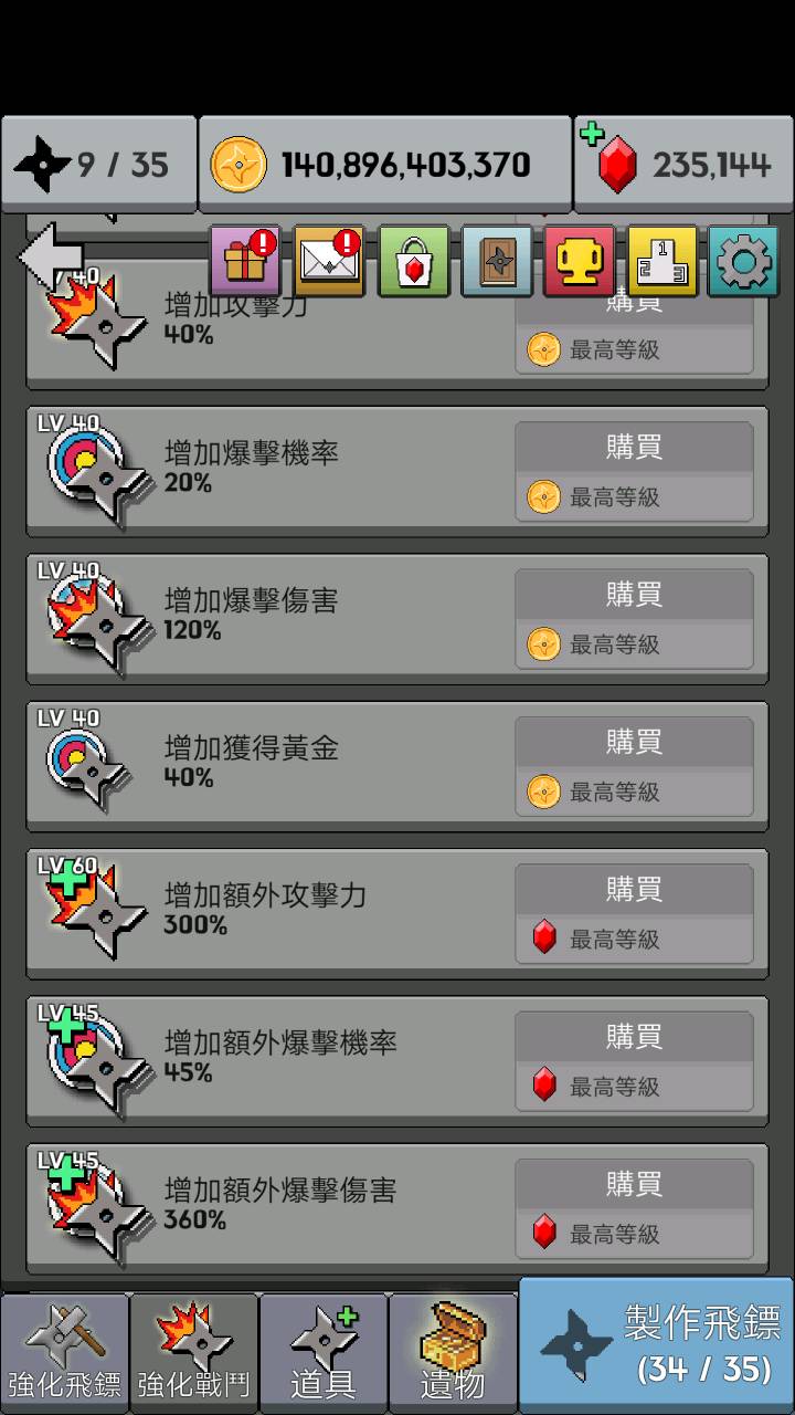 奉劝各位,玩玩就行了,不要拿自己的生命怼这个游戏,你怼不过的。我试过了,全部强化完大概需要1400亿金币,23万宝石,假如你每十分钟刷一波boss,得到50个宝石,需要4600个十分钟,也就是46000分钟,也就是766小时,也就是32天,也就是说想满级你需要不吃不喝每天玩24小时玩够一个月