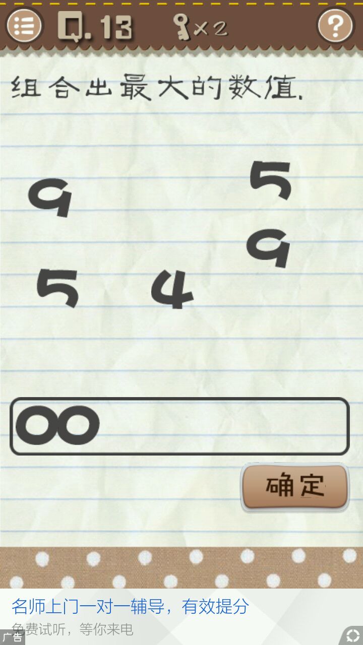 没有最大数所以拖两个“0”进框点击确定即可通关。