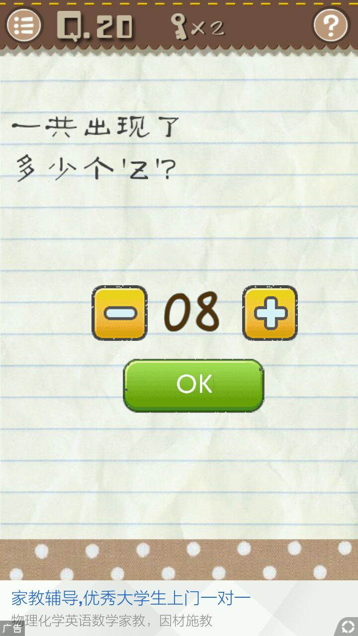 开始还是苹果树那图,只不过“z”会动了,最后数着有几个“z”,有7个“z”,答题界面还有一个“z”则有8个“z”选到8点击ok即可通关