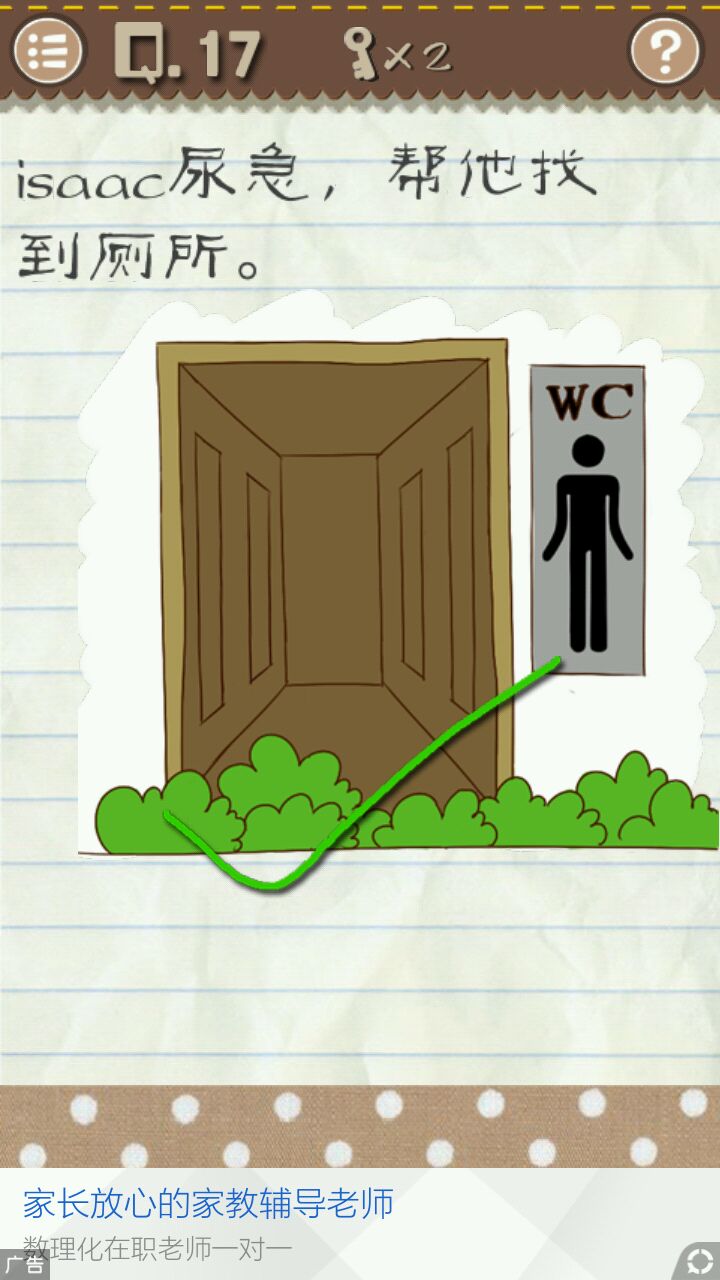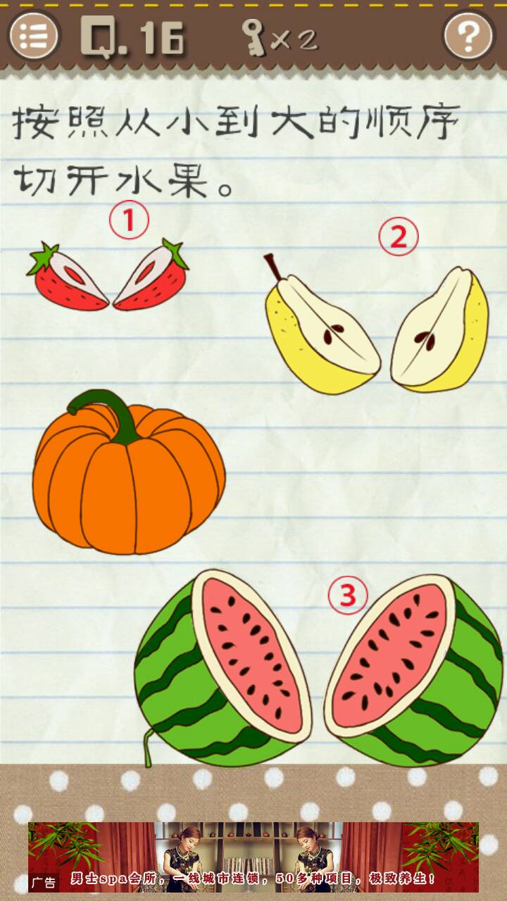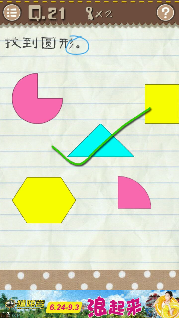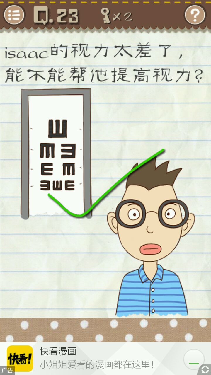 二十一关 这里任何图形都组成不了图形,唯一的图形只有题目的句号,点击句号即可通关。 二十二关 没有另一个草莓了,只能把题目里的草莓拖到盘子里即可通关。 二十三关 把男孩的眼镜镜片擦掉,要多擦几次才能擦掉,擦掉即可通关。 二十四关 二十四关即图四,点击白色的左上角叉叉,内容会变成下一关,点击下一关即可通关。 二十五关 把题目的“脚丫”二字放到题目的“肩膀”上面即可通关。 二十六关 ( • ̀ω•́ )✧老司机秒懂,哪个小姐姐欧派大就点它,所以要点击左上角的小姐姐即可通关。 二十七关 点击两次“1”,在点击一次“8”即可通关。 二十八关 这个英语渣的我是看攻略才知道的,似是与键盘有关,凶手可能是vivian,中文名叫薇薇安..我也不知道它和键盘有什么联系.. 二十九关 把题目“电梯”二字拖到比初始位置高为止,即可通关。 三十关 先点击绿色图形三次,再迅速点击黄色图形五次,不够快可以慢点点击黄色图形,第四次会变成白色,等白色过了会变回黄色,再点一次即可通关