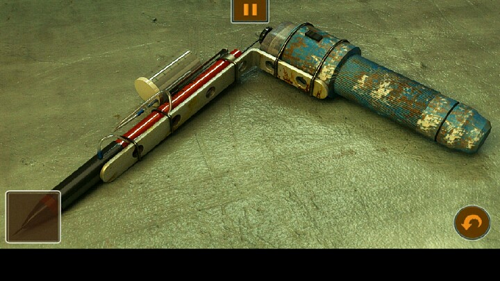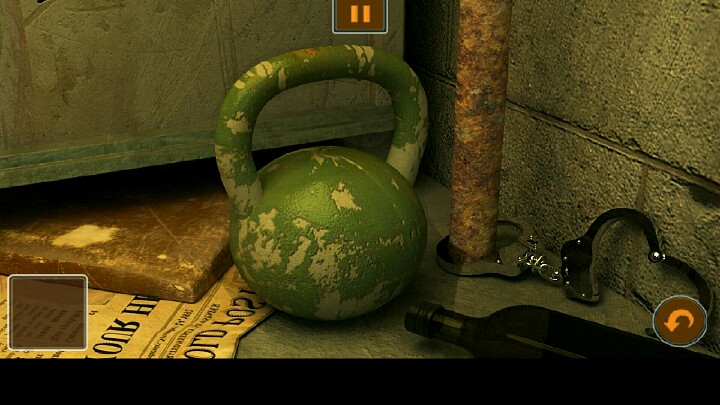 4、用飞镖打开图3中的手铐,得到墨绿色的球,用墨绿色的球砸开地面上的木板,把水桶的水倒入裂缝中,得到漂浮在水面上的铅笔。