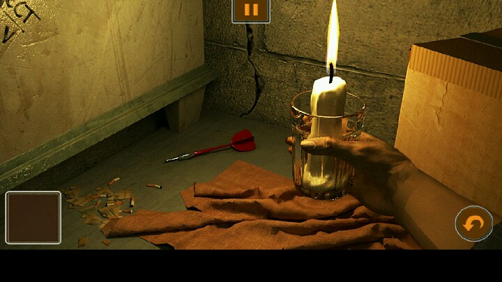 3、用火柴点燃另一个墙壁架子上的蜡烛,得到玻璃杯蜡烛,用蜡烛照亮桌子底部,见图2,得到飞镖。