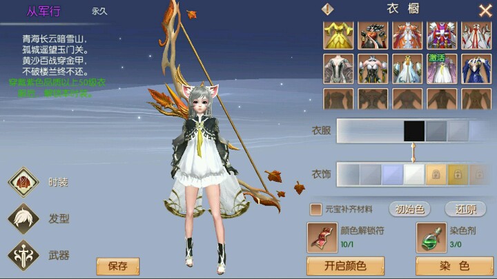 嗯嗯,实际上游戏中时装每10级都有一个等级时装,需要你的装备达到紫色以上就能解锁,这个要求还是挺简单的,然后你完成活动或者是登陆的奖励,会给你染色剂,你就可以自己染色