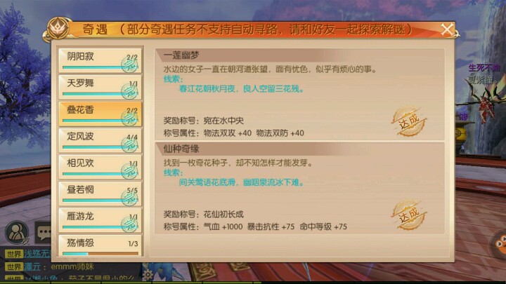 首先,我是在40级的时候做的这些奇遇任务,有的奇遇任务需要等级限制的我会进行强调的。接下来开始就按照顺序说吧~今天系统更新了过后地图坐标更好找了,以前不能直接输入xy坐标,现在可以了,所以更方便了●v●从活动页面可以进入奇遇1、天罗秘事这个自动点开活动-奇遇,自动寻路即可,注意躲红条,站在蓝色的圈里打(重点就是站蓝色圈),获得——称号杀手的信条。2、情深不负这个也是点开活动奇遇,自动寻路。重点是打女鬼而不是打男鬼,因为有时间限制,注意男鬼的红圈,不要进红圈,会大量掉血的!然后就是你生命值太低了就会被鬼魂附身,这个时候就失败了,就要重新来了。当你成功打死女鬼过后,这个时候需要和女鬼进行对话,对话完成即可获得奇遇称号——生死不渝3、苏默之怒这个也是点开活动奇遇自动寻路,然后你就会来到任务所在地。这个也是战斗类型的奇遇,你需要避开九宫格,建议买点补血药,你看到有红色区域出来的时候就赶紧避开,这样迂回进行战斗,然后胜利过后就会获得称号——小拳拳捶你胸口