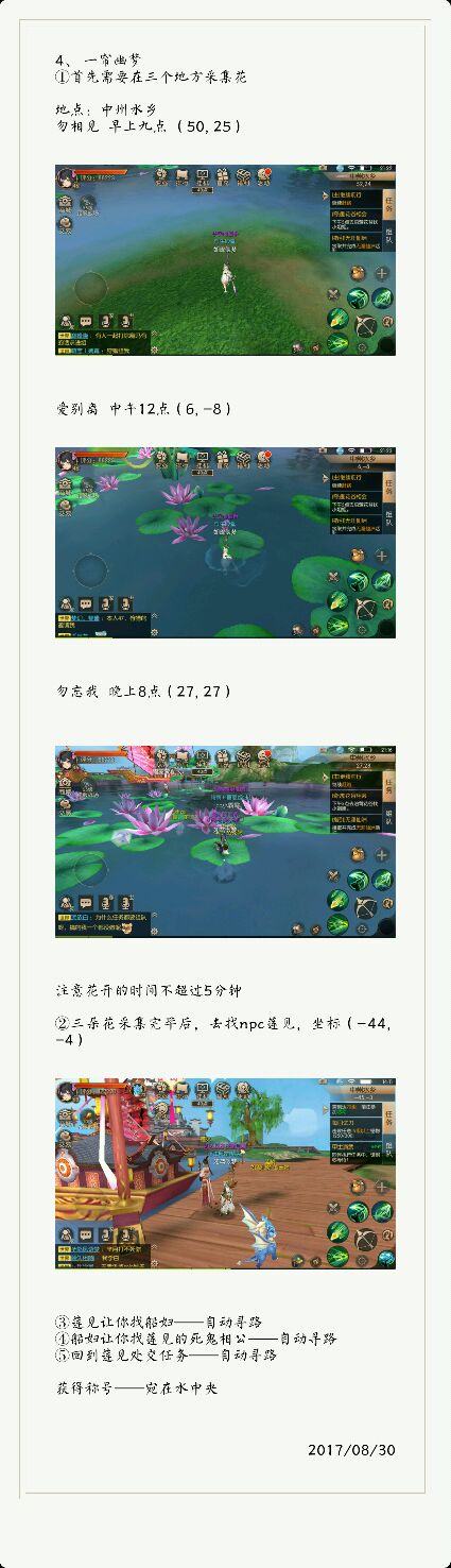 7、踏歌闻悲泣①下午6-7点在中州水乡坐标(49,-72)出现漂亮的小姐姐npc②一直跟小姐姐对话,小姐姐要先哭一会,直到小姐姐给你任务,让你去船上找锦囊③就去旁边的船上找锦囊,建议不要飞,用步行,因为你看不到锦囊的,但是你走的过程中要是出现了一个小手手的标志也就是摘取,不要犹豫,点下去,然后你就可以找到锦囊了④回到小姐姐处交任务,小姐姐告诉你第二天下午5点去泊莺花谷坐标(-21,28)去找她。然后成功get称号——向美少女势力低头