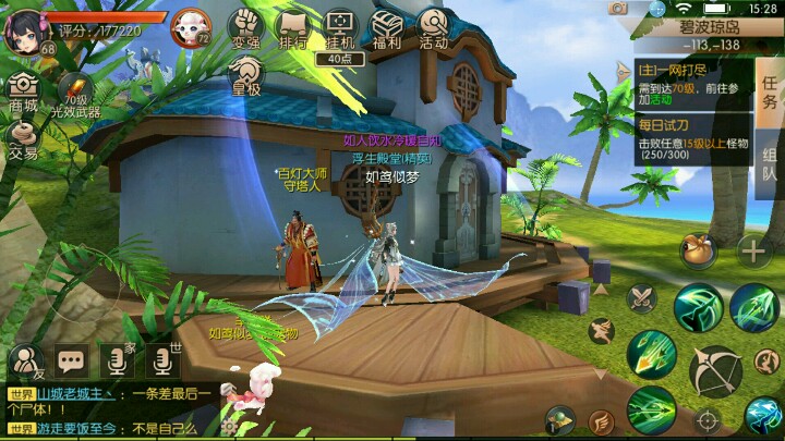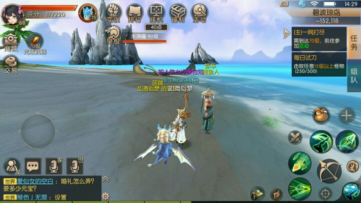 6、碧波寻锦鲤①去碧波琼岛找药商妹子,买个15个西湖醋鱼,然后找捕鱼人,坐标(-152,118)②跟捕鱼人对话,一次消耗一盘西湖醋鱼,这个时候就看你脸白还是脸黑了,我用了14盘西湖醋鱼,捕鱼人才给我任务。③得到任务,去附近的水藻里面捞锦鲤,当然你会捞出杂物,那就在背包里出售吧~④脸比较白的捞几次就捞到了,脸黑估计要捞个十多次,然后得到锦鲤交给捕鱼人,得到称号——转发这条锦鲤