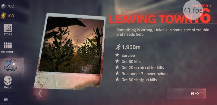 一章之六 任务目标: 1.活下来。 2.杀死60只。 3.使用切割机杀死20只。(不知翻譯對不對…)4.經過3座高電壓塔的下方。5.使用霰弹枪杀死20只。