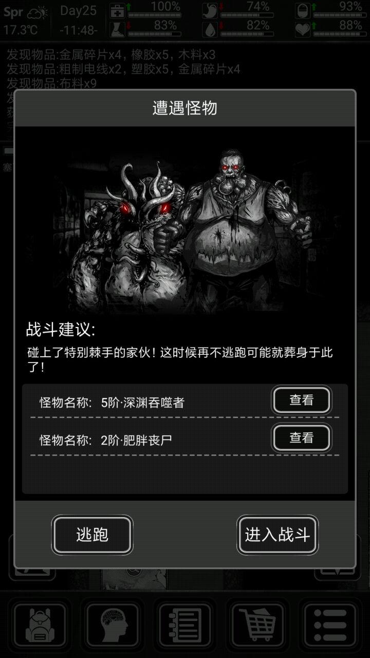 这款游戏可要比死亡日记简单多了,至少水资源根本不缺,甚至可以说是泛滥(我背包满了第一个扔的就是水),几天下来就已经攒了几十瓶饮用水了。食物的话,随便搜刮一个房子就能找到一两个,看一次广告也能得到一桶爆米花(虽然一次只加5点饥饿值),到了后期造出了温室,就可以自己种植农作物了。所以说这游戏里的食物其实也不难搞。然后就是它的自由度在同类型游戏中算是比较高的了,如果在房子里看到敌人,你可以选择绕开它们,不用像其它游戏那样必须要战斗消灭敌人才能继续玩。总体来说这款游戏还是相当不错的,喜欢这种文字冒险类游戏的玩家可以试试。