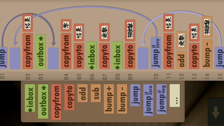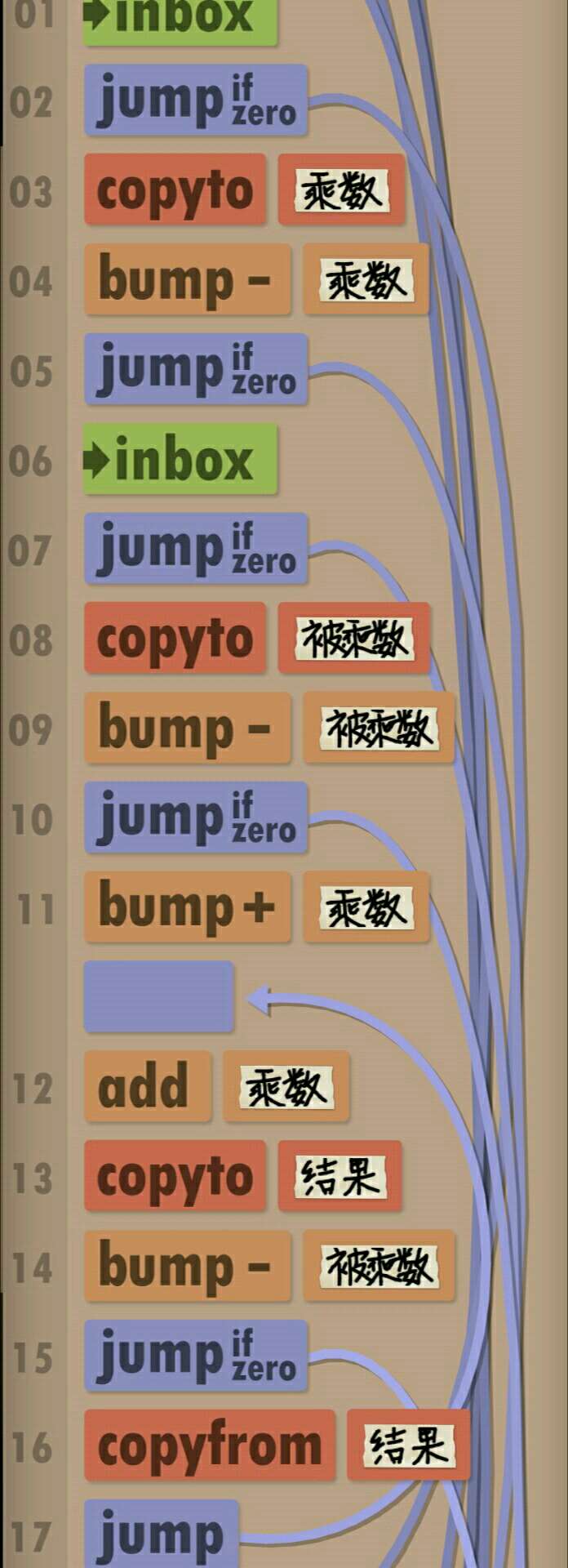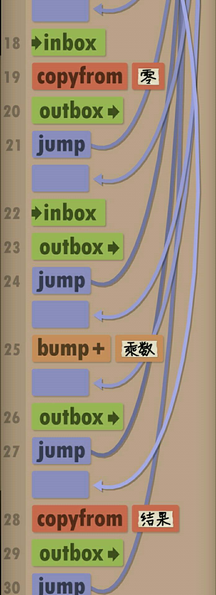 因为图太长了,无法完整截下来。inbox 上面还有jump 的标志,就是每个outbox后面的jump都会直接跳跃回到inbox 头上。其实这是最原始的数字机器,将所有情况归类,虽然看起来复杂但步数却大大减少。
