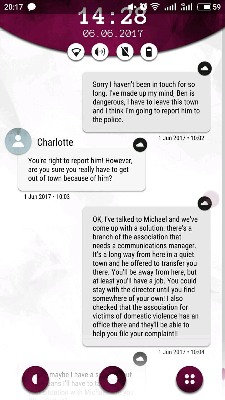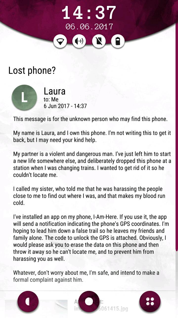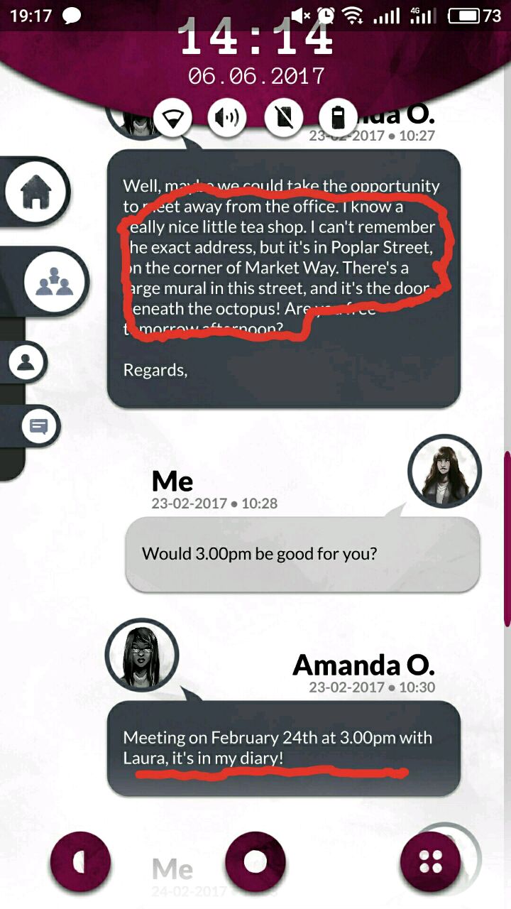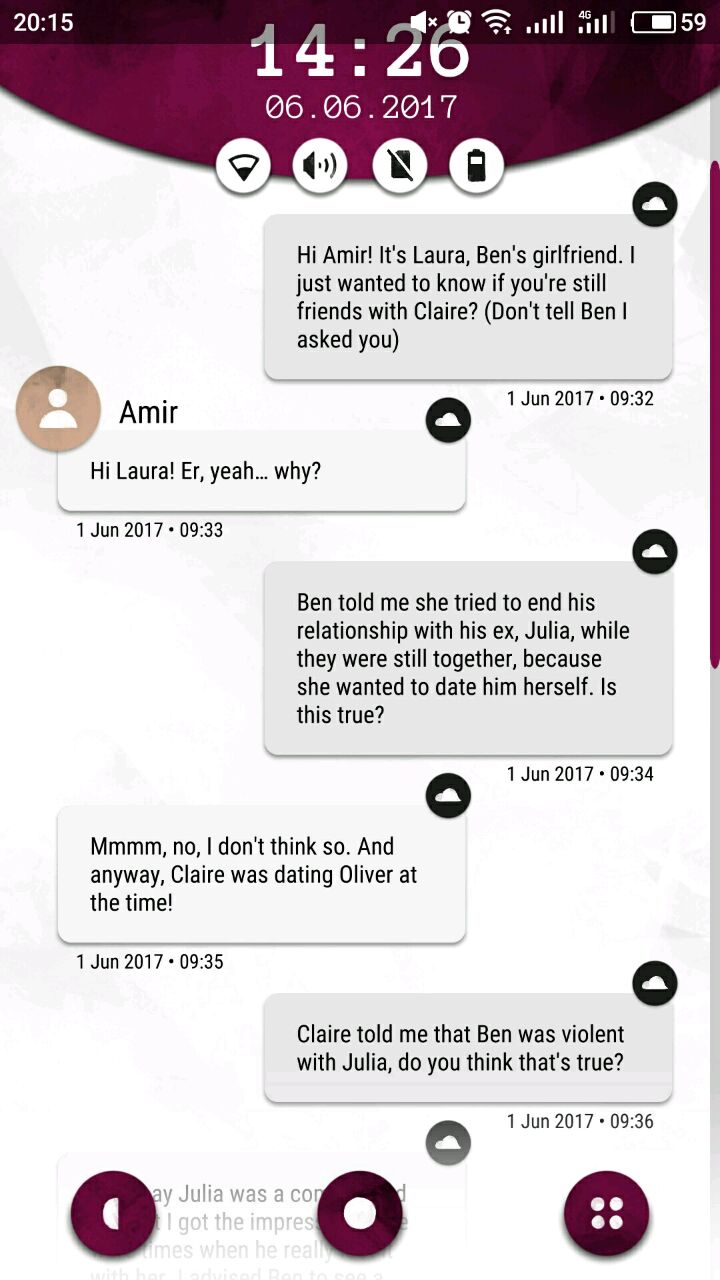 首先打开以后,界面是酱婶儿的,机主是laura,她的现任男票叫ben,从短信里能知道她家(laura and ben)门口密码是4004,这个后面有用,先把网打开,在note笔记里面找,有个密码界面,wifi密码是:6389856,打开网之后就能联网接收邮件啦~然后从邮件,短信的内容推测每个人的名字和脸搭配起来,