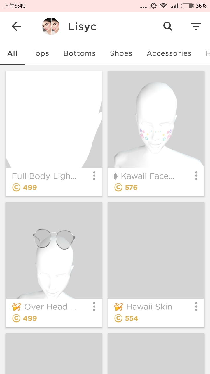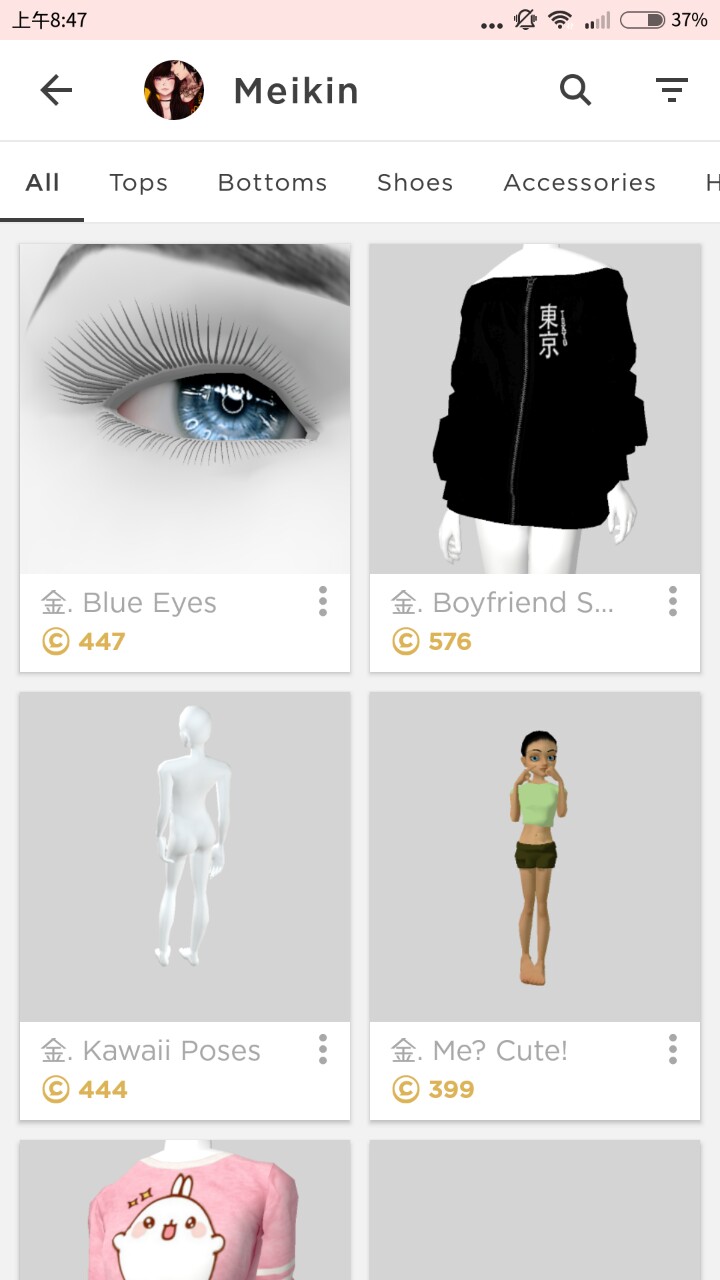 好的这里就是所谓教程向评论的唯一教程点了。从上面的模块Ⅱ说到了从试衣间拍照,那我就在这里帮帮懵逼的小萌新(´◔◡◔`)首先我们进入游戏(废话),然后点我们左上角的小头像,然后在超多的英文单词里找到“shop”,它左边有一个购物袋的图标,tap一下,就可以发现英文更多了(英文学渣跪)。没关系,不要慌,我们只需要看衣服图片,不需要读懂那些妈卖批英文!然后发现有一排单词,而你所在的是个首页,也就是那一排单词变橙色的那个单词,然后往右边看,就能看到“top”啥的(看我评论的图片),从“all”开始向右依次是全部(all),上衣(top),下衣(bottoms),鞋(shoes),饰品(accessories),发型(hairstyles),眼睛;美瞳(eyes),脸(heads),姿势(avatars),我的心愿单(my wishlist)。找到一个喜欢的,点它的图片,然后就能进入试衣间咯~