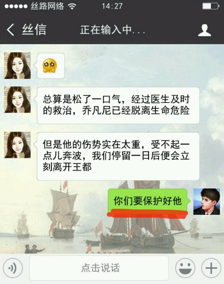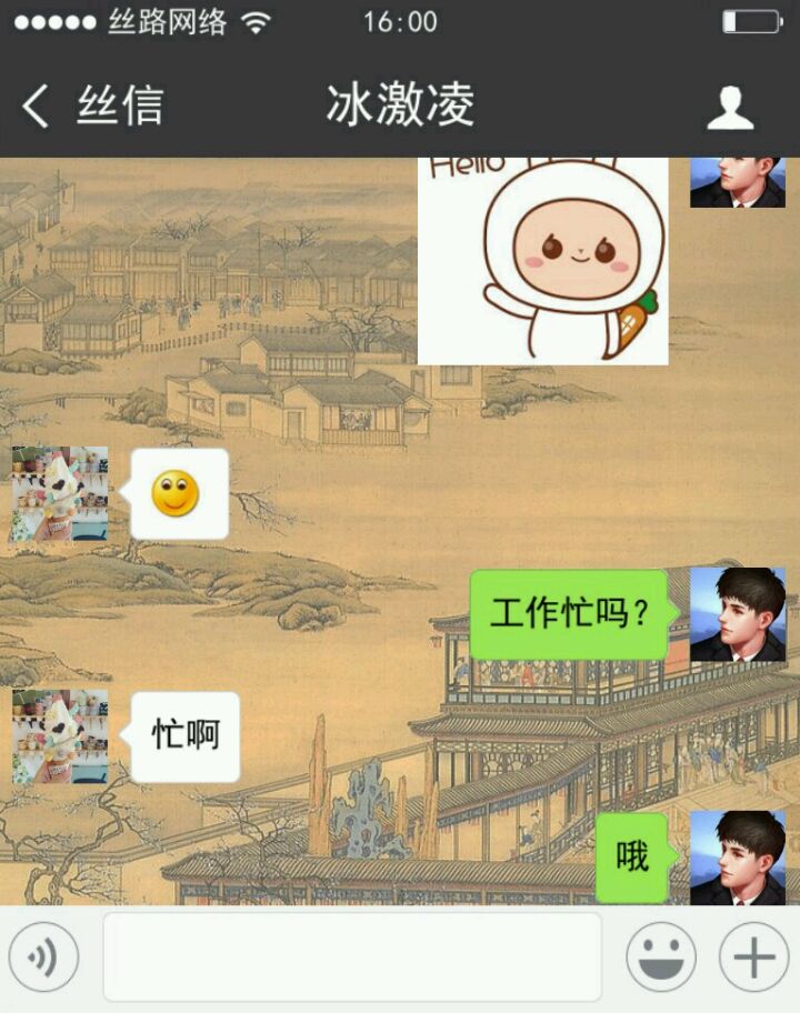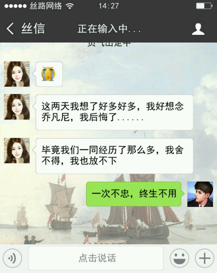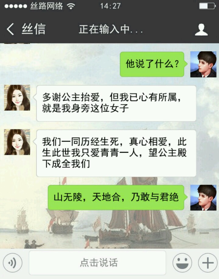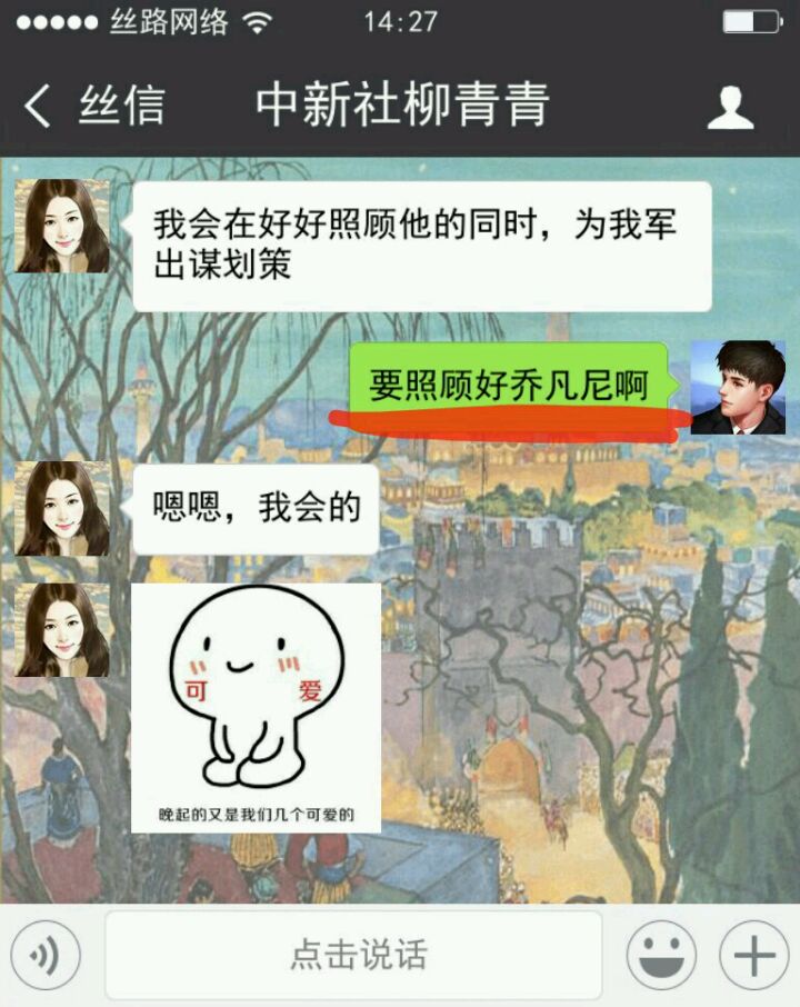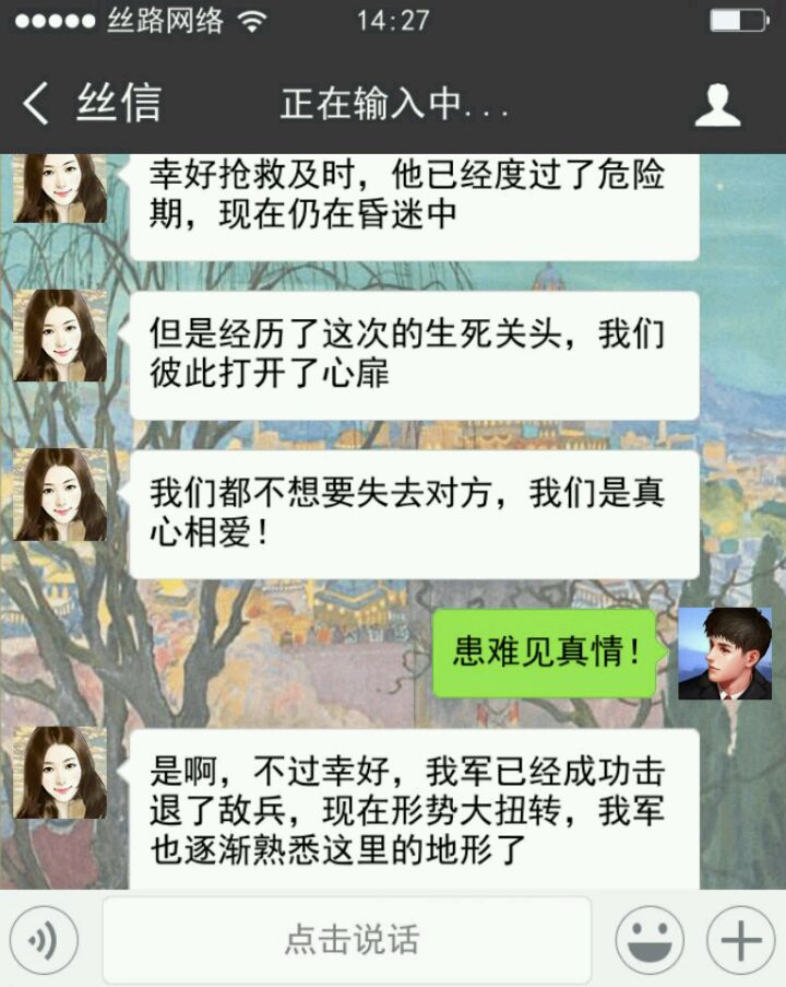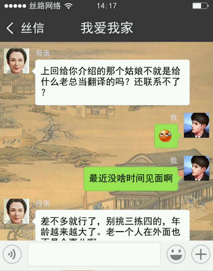 可能是我脑回路与常人不大相同,打开游戏第一步我点了微信中的“我”。再点设置,是重置游戏和关于游戏官网。(除了 相册 和 游戏 还可以点,其他都不行)点了半天其他内容,然后还刷了朋友圈,试了点赞发现不太对。才返回聊天列表,从最底下看起。所以等我最后发现柳青青是女主时,我还有点懵,我还在想那个列表里面的“冰淇淋”和男主什么关系。正式开始剧情还隔会去看看其他聊天信息 ( •ิ_• ิ),听听“一带一路”之歌(个人觉得小哥哥声音好听啊_(:彡」∠)_)。和女主越聊越觉得她可爱,就开始撮合她和乔凡尼,中间了解了解一些知识。最后她和乔凡尼在一起是真不易,我感觉我这个红娘操碎了心啊,还好之后有个盛大婚礼,看到他们在一起开心吖ヾ(●´∇`●)ノ~。有评论说男主是备胎,我一开始就没想和青青在一起过,所以可能会觉得就两朋友在互侃啊。中途给我撒撒狗粮,发发美图。她开心我也开心,尤其是柳青青发滑稽笑的时候,情不自禁的笑了起来。_(:D)∠)_游戏就是宣传一带一路吧,有些消息内容插的比较生硬,整体剧情其实还挺好的。