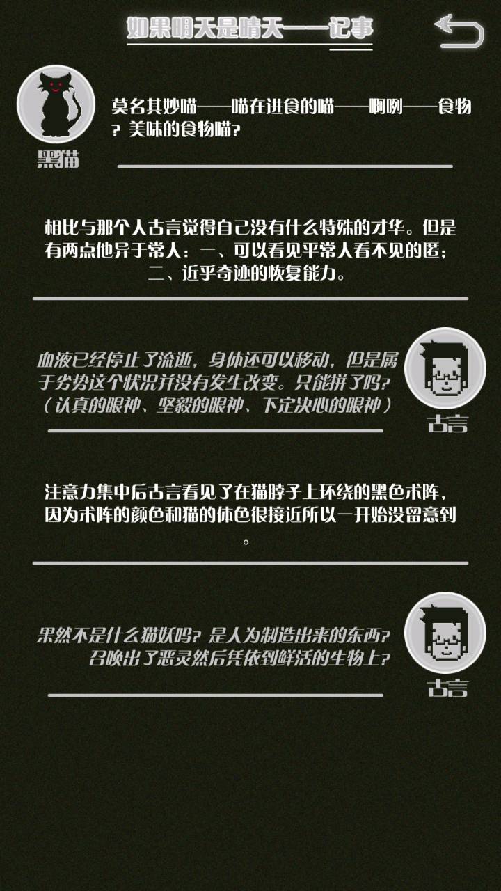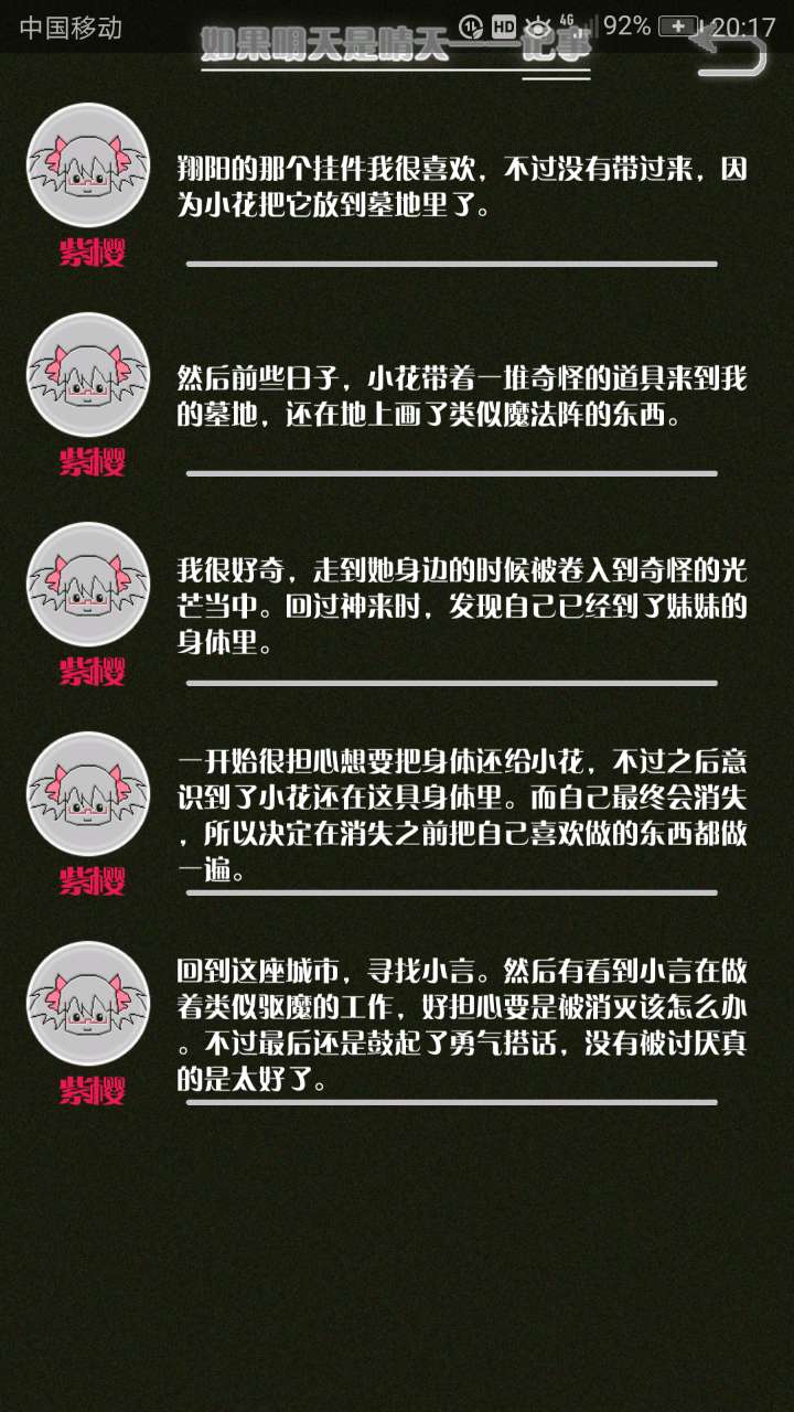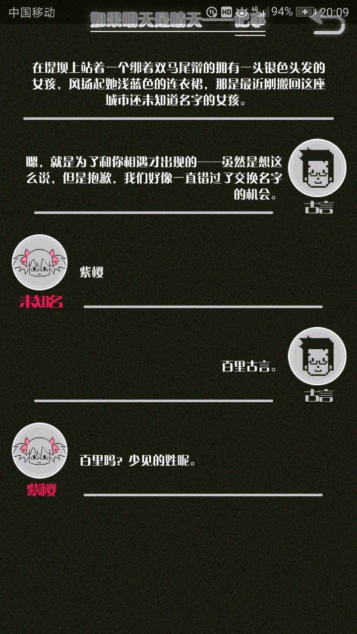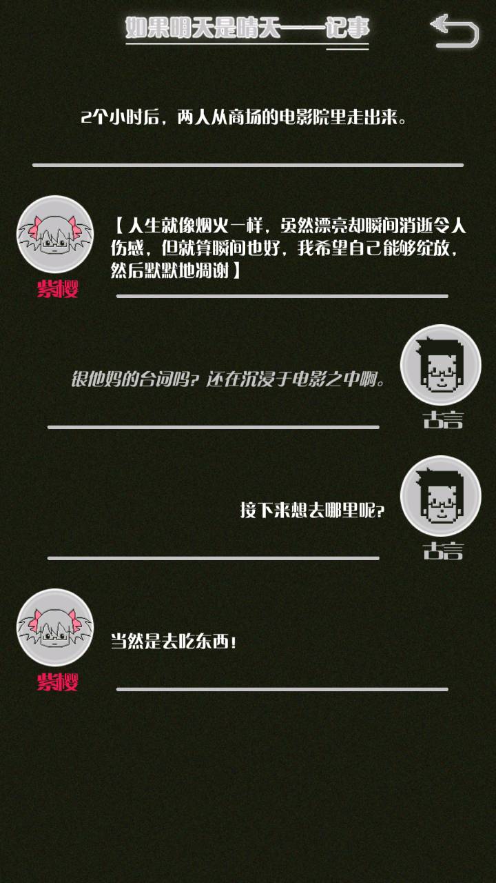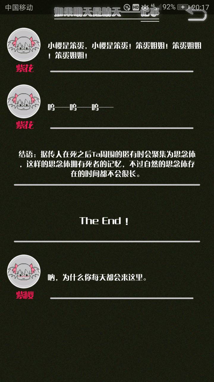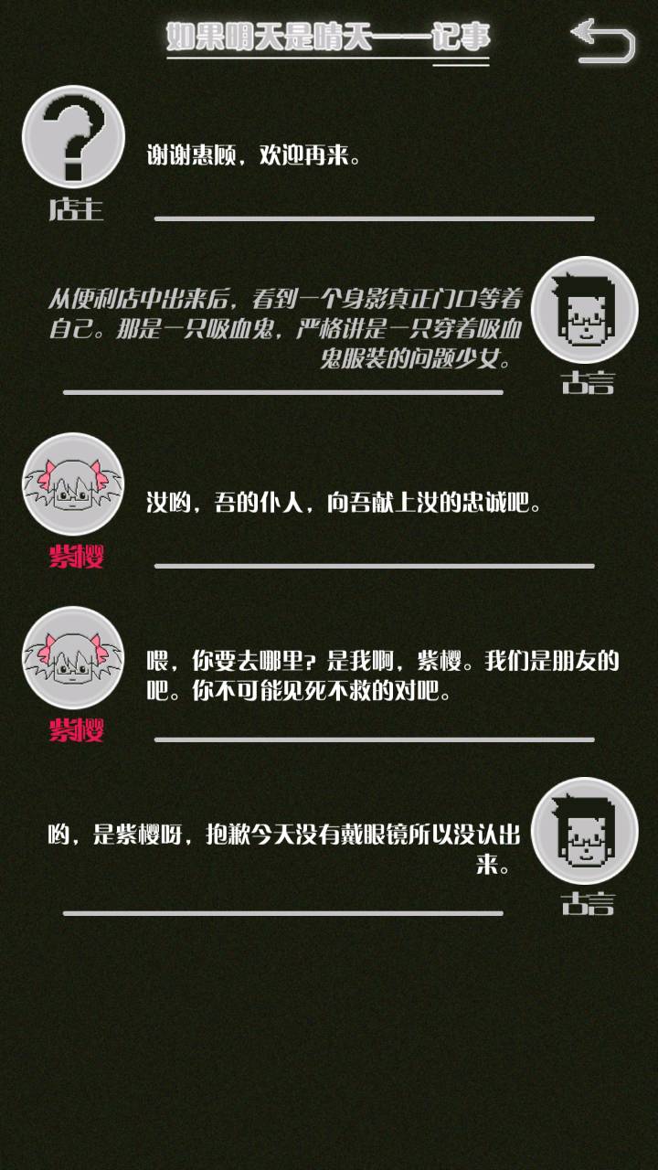 这是我自己打的一个结局 主角叫百里古言,是一名有特殊能力的高三学生,能够看到一种叫匿的生物。 故事的开始是来自古言和紫樱的相遇,紫樱是古言在路上碰到的15岁女孩,他们成为了朋友,可惜好景不长,紫樱要搬走,他们约定在紫樱走前最后一次相见:如果明天是晴天那就见面。可是那天下雨了,古言一直等一直等还是没等到紫樱。一个自称是紫樱弟弟的人来了给了古言一个东西,从此就再也没见过紫樱 之后的故事中古言遇见了篮球部的同学慕林,被欺负的独角兽女孩旗礼王子(一个女孩叫王子?)等人,并遇见了恶灵匿,结果有一天又遇见了紫樱,那天却没有印象了,回到学校变得很受欢迎,虽然状况良好但是却好像忘记了什么。最后被王子邀请到家里喝了茶以后陷入黑暗之中。 结局古言与(打不出)味火交谈,就恢复了记忆,意识到萤(就是紫樱?)四年前为了救自己被招来的恶灵杀死了,自己的身体也被恶灵侵占了,所以失忆。最后古言感叹自己还是没能成功,希望下次去一个一直是晴天的地方生活,就陷入黑暗之中