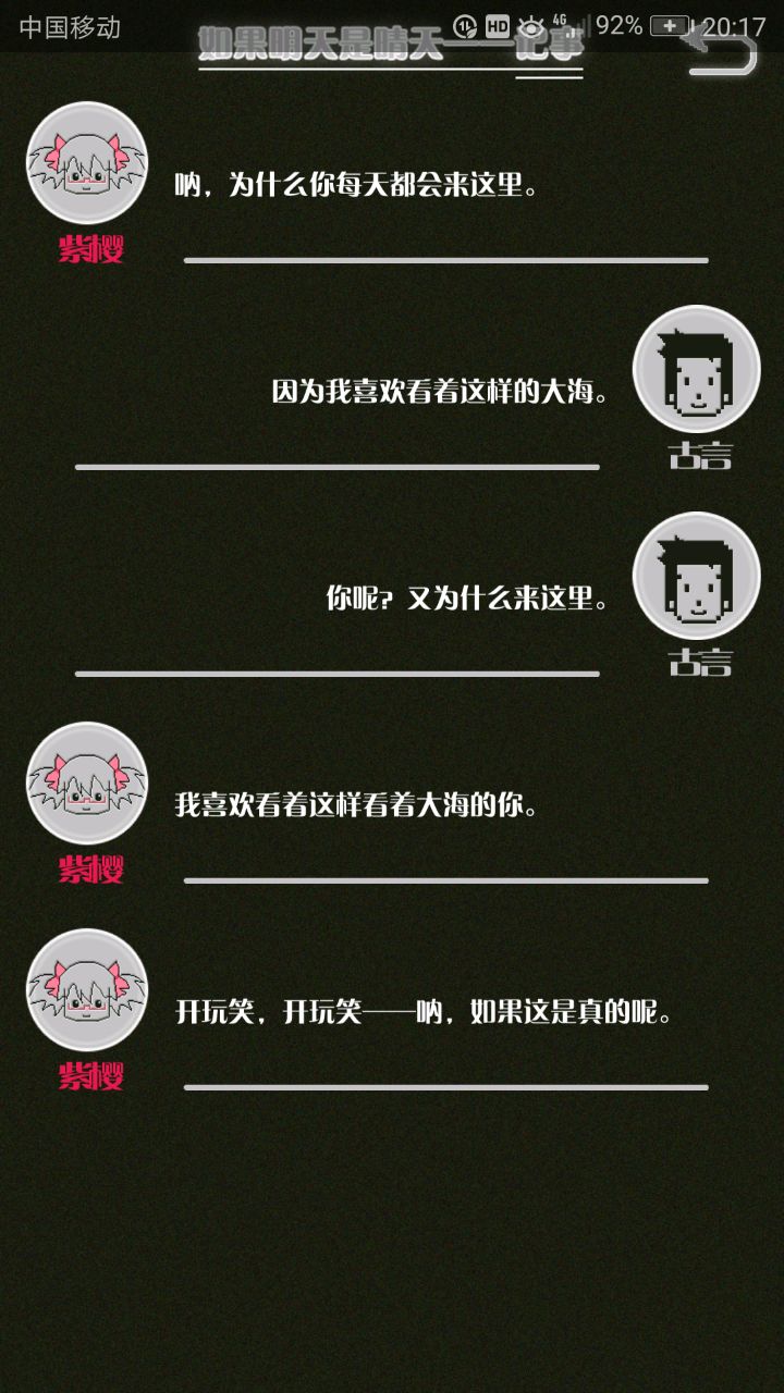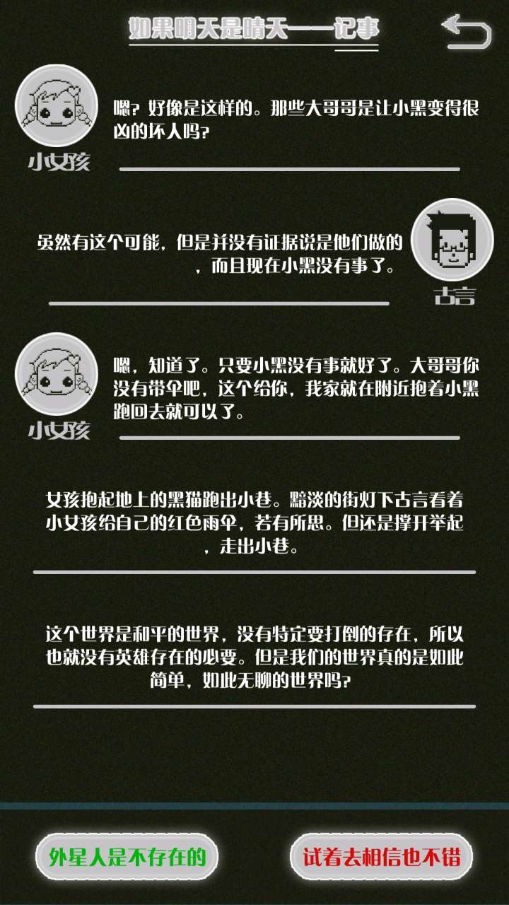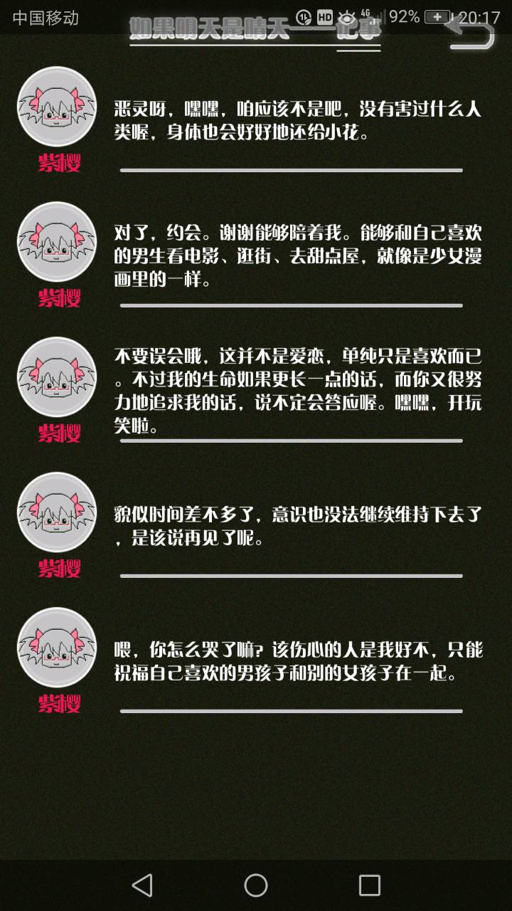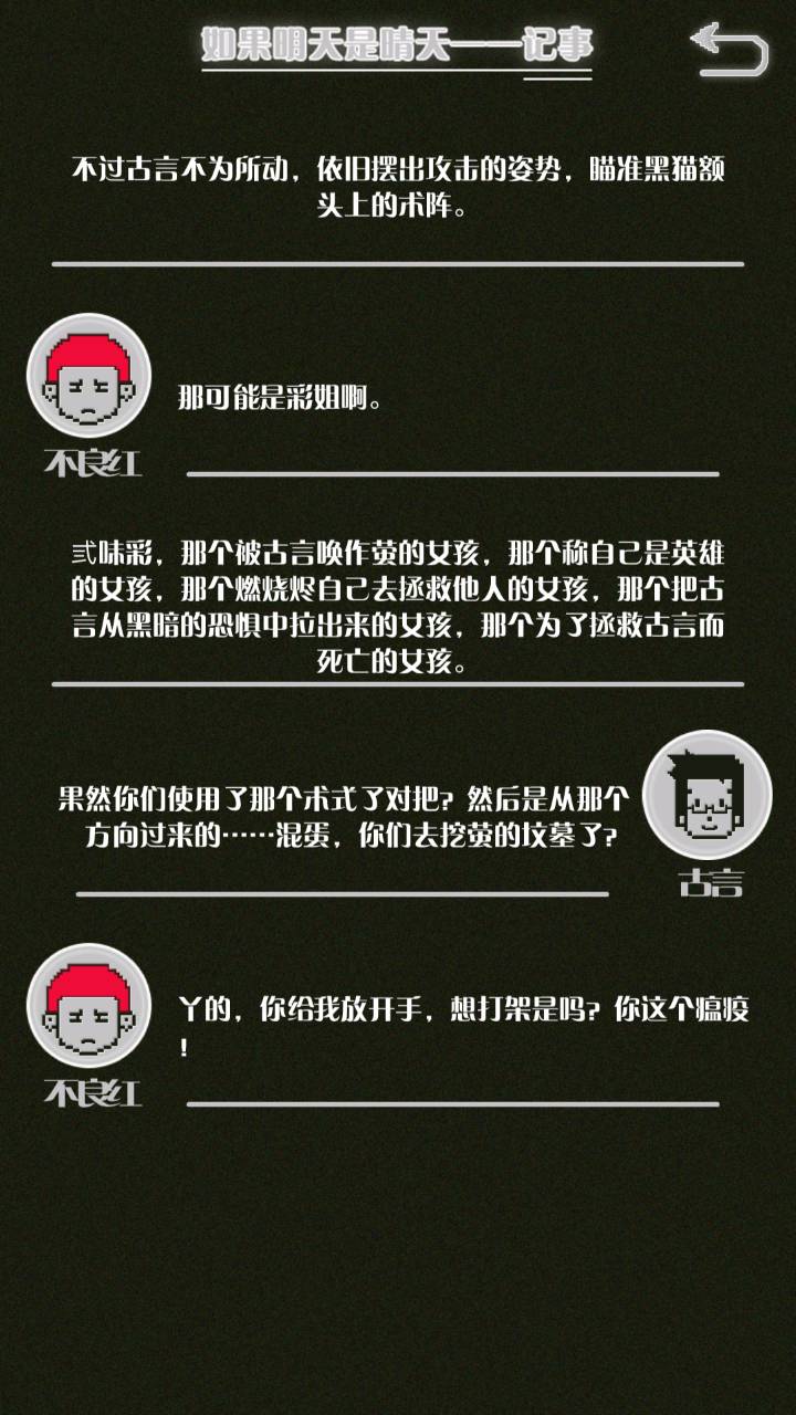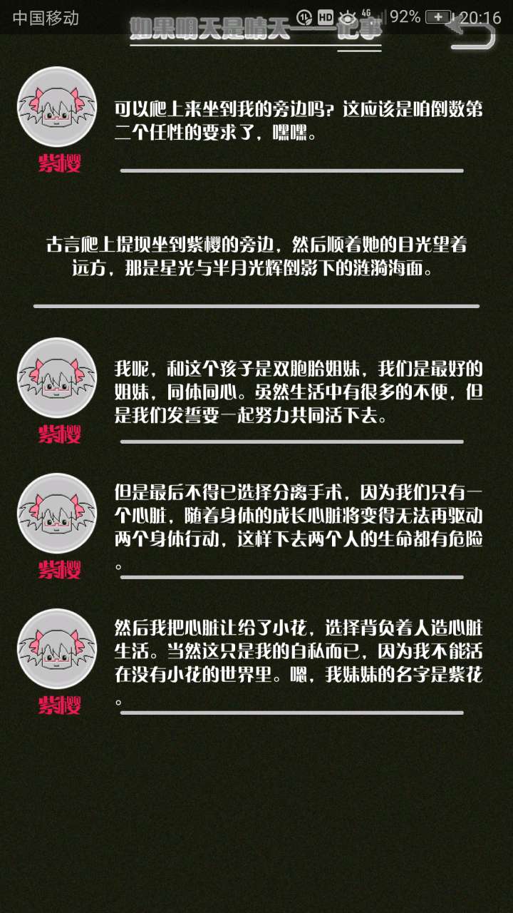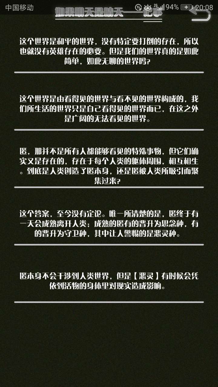 这是我自己打的一个结局 主角叫百里古言,是一名有特殊能力的高三学生,能够看到一种叫匿的生物。 故事的开始是来自古言和紫樱的相遇,紫樱是古言在路上碰到的15岁女孩,他们成为了朋友,可惜好景不长,紫樱要搬走,他们约定在紫樱走前最后一次相见:如果明天是晴天那就见面。可是那天下雨了,古言一直等一直等还是没等到紫樱。一个自称是紫樱弟弟的人来了给了古言一个东西,从此就再也没见过紫樱 之后的故事中古言遇见了篮球部的同学慕林,被欺负的独角兽女孩旗礼王子(一个女孩叫王子?)等人,并遇见了恶灵匿,结果有一天又遇见了紫樱,那天却没有印象了,回到学校变得很受欢迎,虽然状况良好但是却好像忘记了什么。最后被王子邀请到家里喝了茶以后陷入黑暗之中。 结局古言与(打不出)味火交谈,就恢复了记忆,意识到萤(就是紫樱?)四年前为了救自己被招来的恶灵杀死了,自己的身体也被恶灵侵占了,所以失忆。最后古言感叹自己还是没能成功,希望下次去一个一直是晴天的地方生活,就陷入黑暗之中