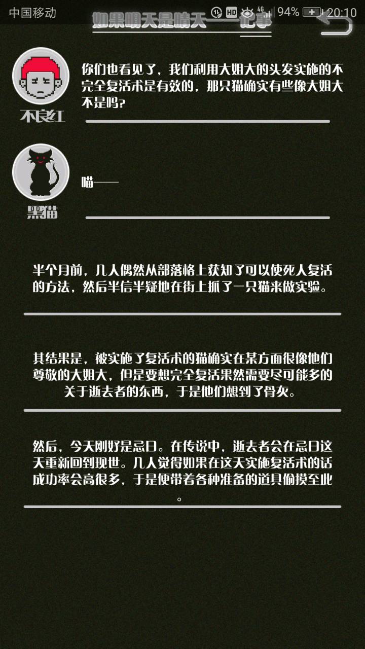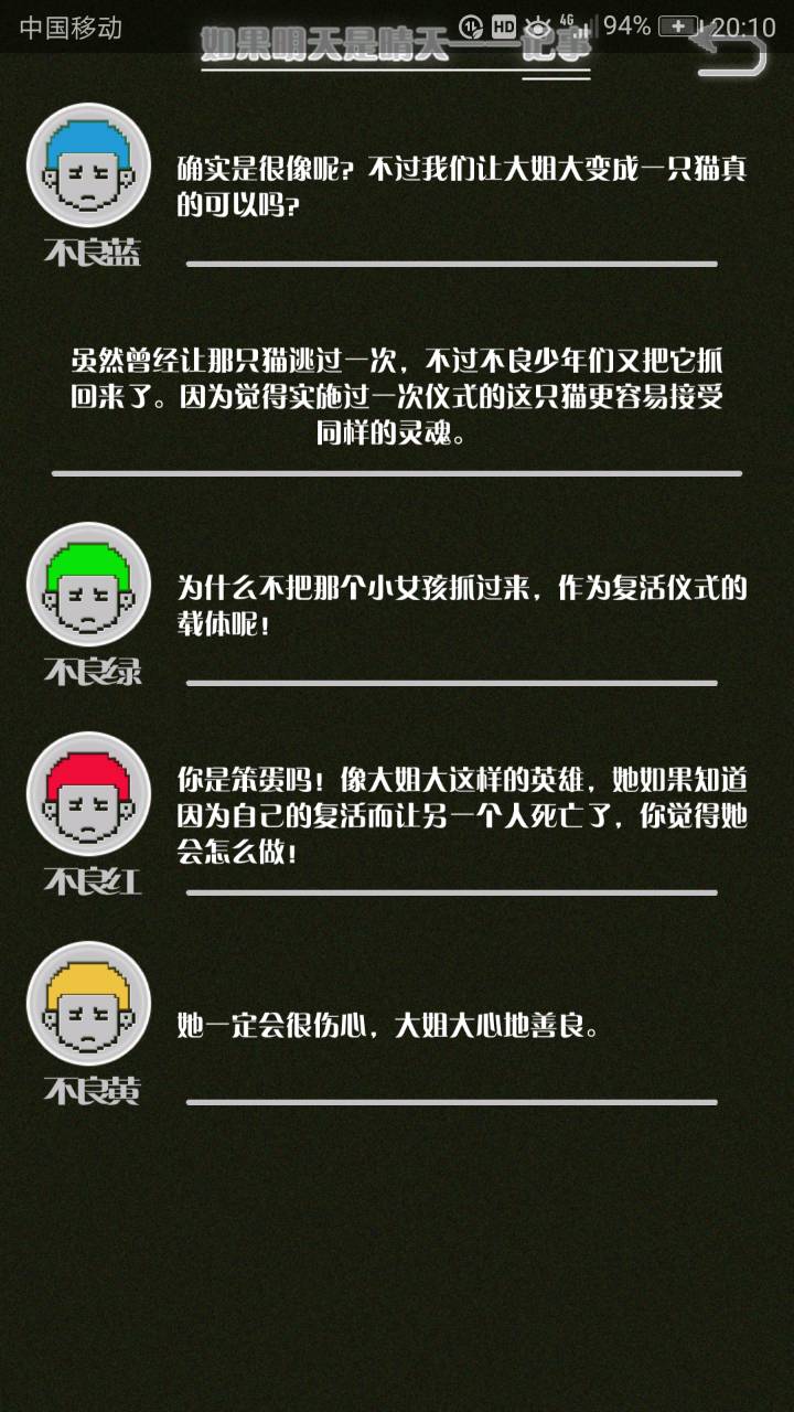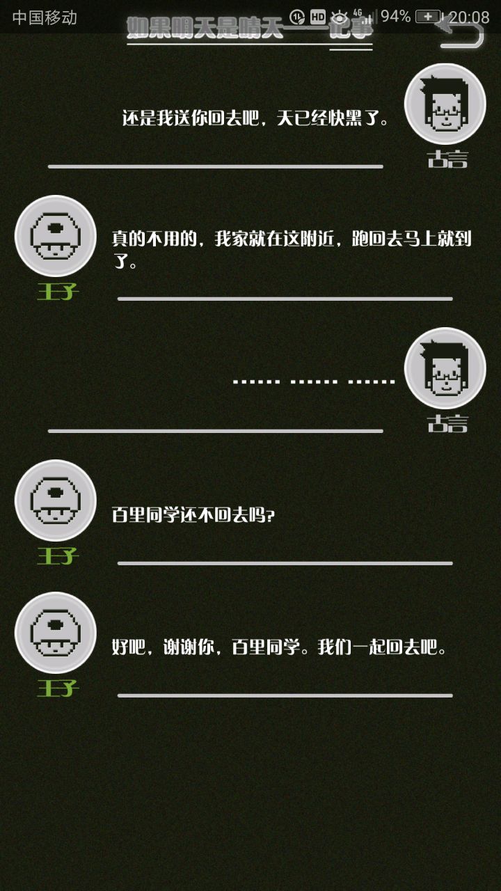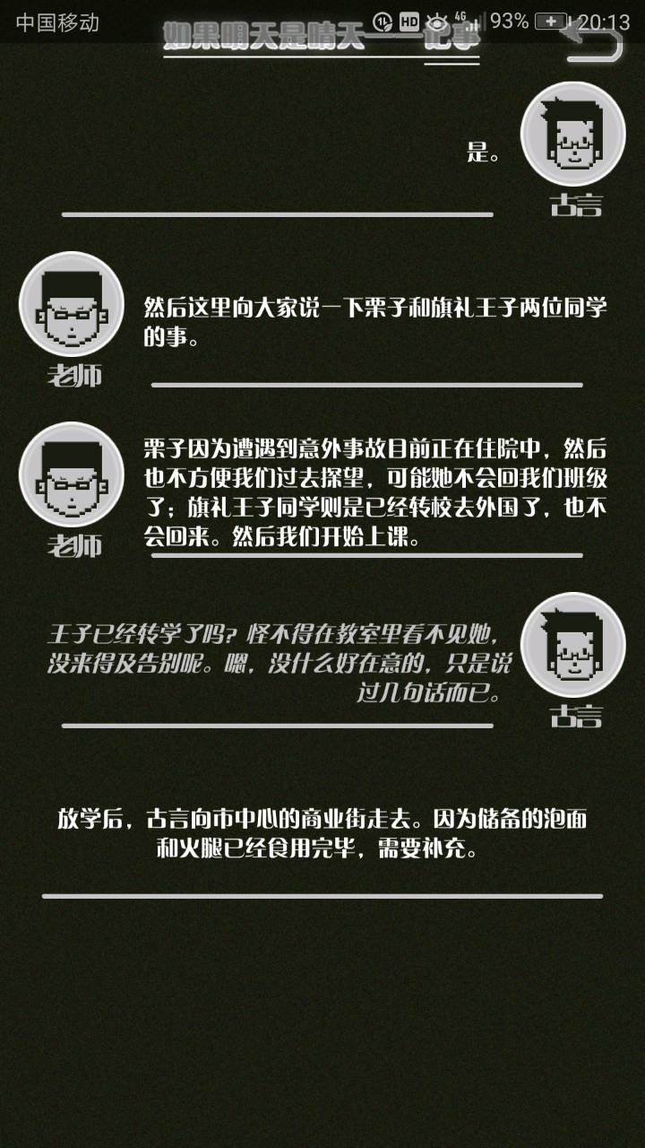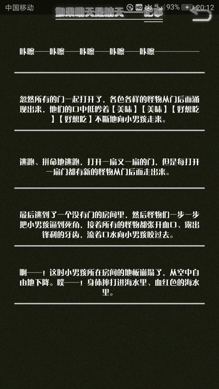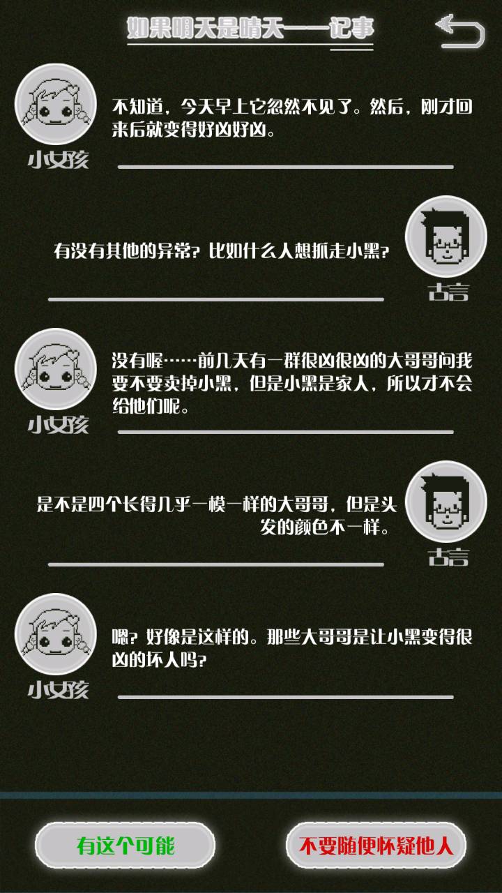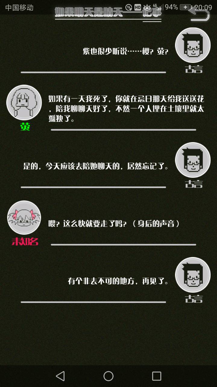 这是我自己打的一个结局 主角叫百里古言,是一名有特殊能力的高三学生,能够看到一种叫匿的生物。 故事的开始是来自古言和紫樱的相遇,紫樱是古言在路上碰到的15岁女孩,他们成为了朋友,可惜好景不长,紫樱要搬走,他们约定在紫樱走前最后一次相见:如果明天是晴天那就见面。可是那天下雨了,古言一直等一直等还是没等到紫樱。一个自称是紫樱弟弟的人来了给了古言一个东西,从此就再也没见过紫樱 之后的故事中古言遇见了篮球部的同学慕林,被欺负的独角兽女孩旗礼王子(一个女孩叫王子?)等人,并遇见了恶灵匿,结果有一天又遇见了紫樱,那天却没有印象了,回到学校变得很受欢迎,虽然状况良好但是却好像忘记了什么。最后被王子邀请到家里喝了茶以后陷入黑暗之中。 结局古言与(打不出)味火交谈,就恢复了记忆,意识到萤(就是紫樱?)四年前为了救自己被招来的恶灵杀死了,自己的身体也被恶灵侵占了,所以失忆。最后古言感叹自己还是没能成功,希望下次去一个一直是晴天的地方生活,就陷入黑暗之中