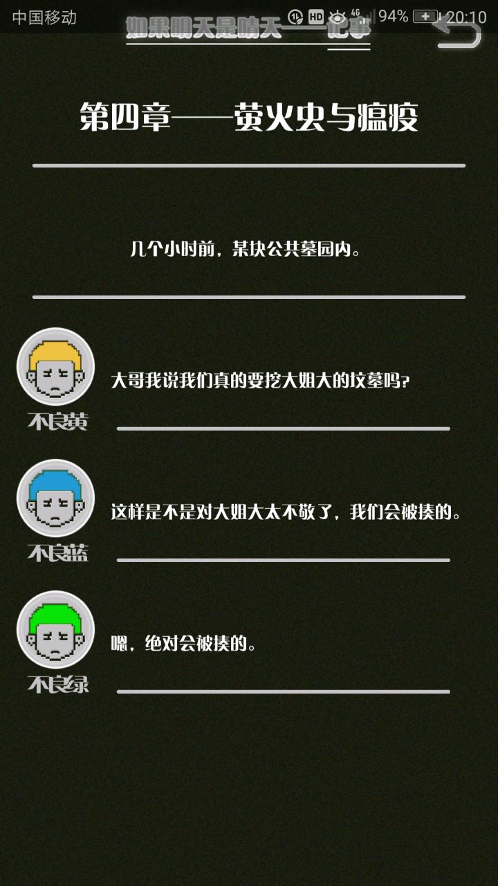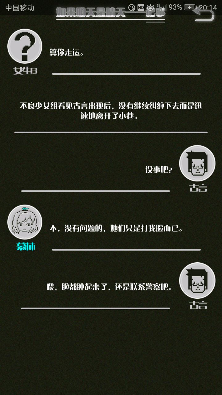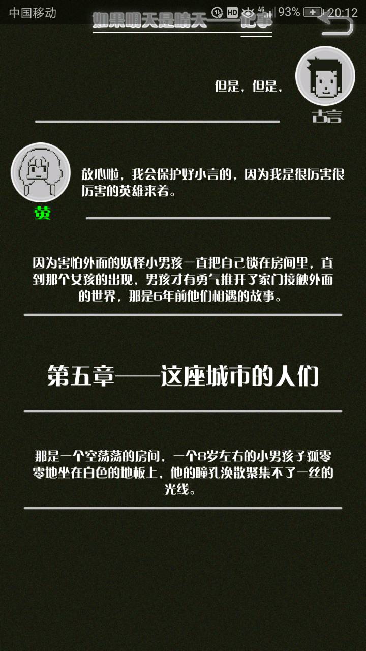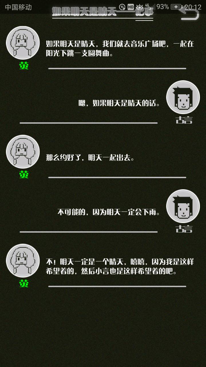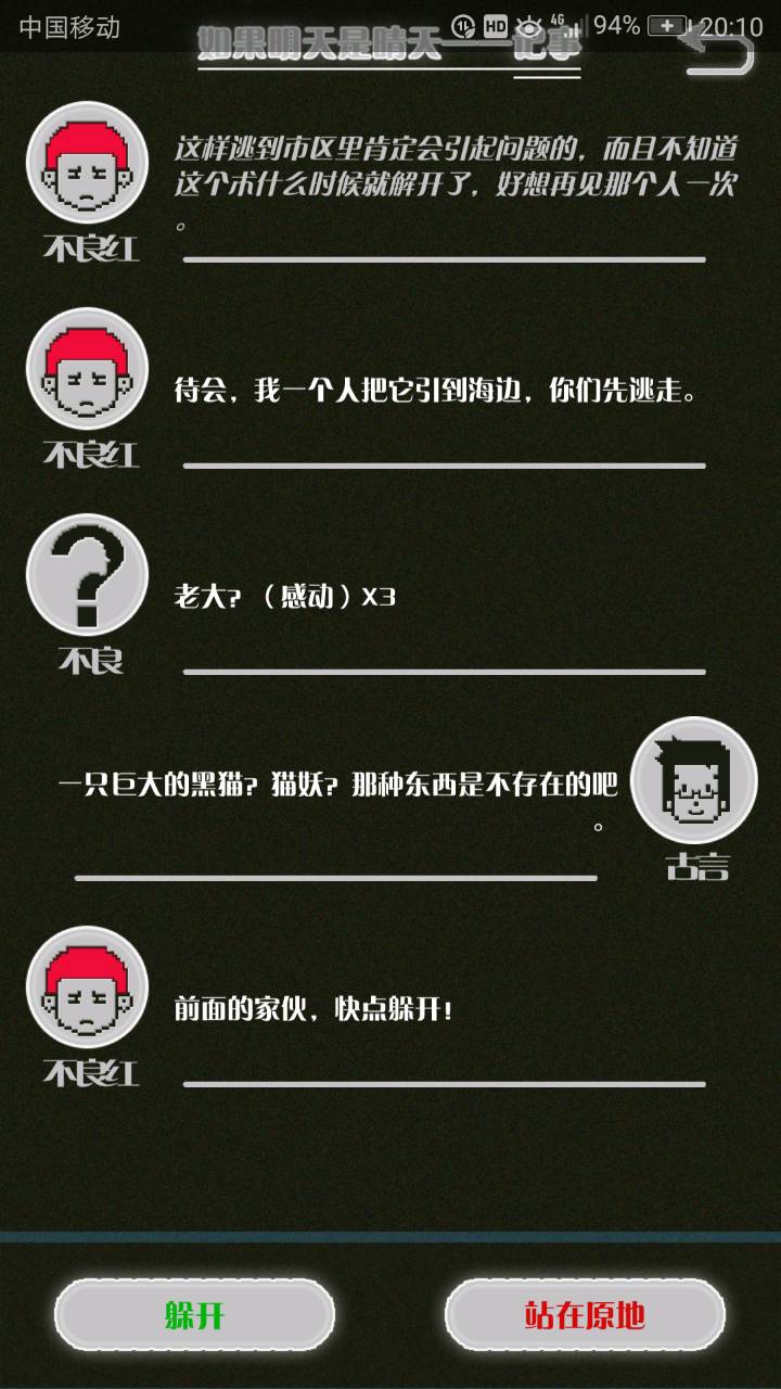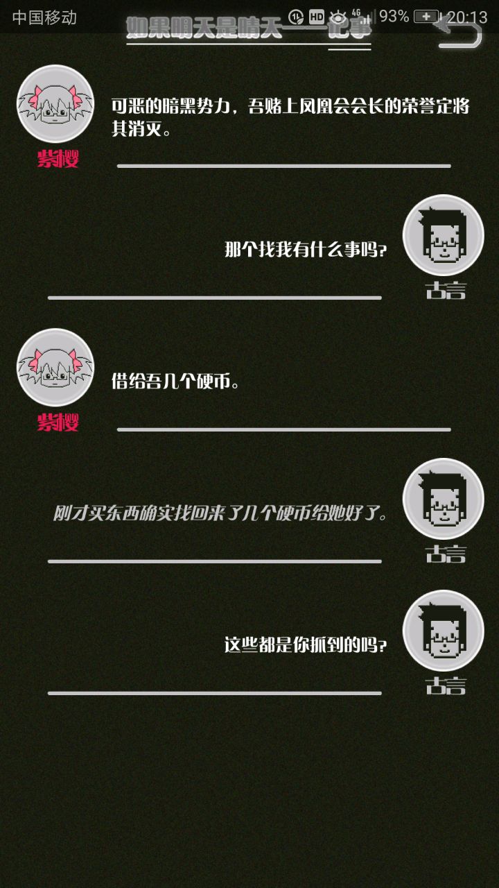这是我自己打的一个结局 主角叫百里古言,是一名有特殊能力的高三学生,能够看到一种叫匿的生物。 故事的开始是来自古言和紫樱的相遇,紫樱是古言在路上碰到的15岁女孩,他们成为了朋友,可惜好景不长,紫樱要搬走,他们约定在紫樱走前最后一次相见:如果明天是晴天那就见面。可是那天下雨了,古言一直等一直等还是没等到紫樱。一个自称是紫樱弟弟的人来了给了古言一个东西,从此就再也没见过紫樱 之后的故事中古言遇见了篮球部的同学慕林,被欺负的独角兽女孩旗礼王子(一个女孩叫王子?)等人,并遇见了恶灵匿,结果有一天又遇见了紫樱,那天却没有印象了,回到学校变得很受欢迎,虽然状况良好但是却好像忘记了什么。最后被王子邀请到家里喝了茶以后陷入黑暗之中。 结局古言与(打不出)味火交谈,就恢复了记忆,意识到萤(就是紫樱?)四年前为了救自己被招来的恶灵杀死了,自己的身体也被恶灵侵占了,所以失忆。最后古言感叹自己还是没能成功,希望下次去一个一直是晴天的地方生活,就陷入黑暗之中