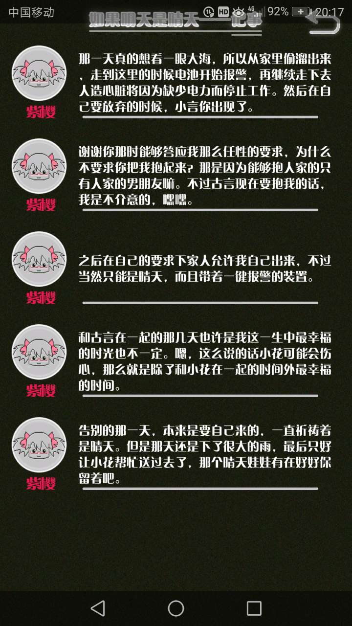 故事的开始是来自古言和紫樱的相遇,紫樱是古言在路上碰到的15岁女孩,他们成为了朋友,可惜好景不长,紫樱要搬走,他们约定在紫樱走前最后一次相见:如果明天是晴天那就见面。可是那天下雨了,古言一直等一直等还是没等到紫樱。一个自称是紫樱弟弟的人来了给了古言一个东西,从此就再也没见过紫樱