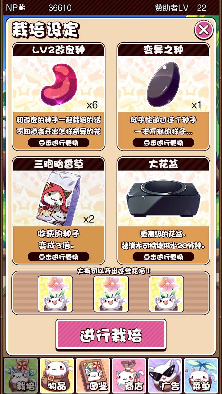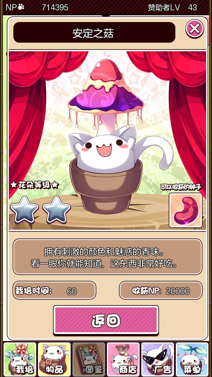 首先你得有魅惑种子,商店升级或者种出日暮草就有。 另一个选便宜点的,最普通的那个种子就行,目的只是为了让它长出来蘑菇然后刷改良种子。 猫粮用三胞胎,对的目的就是为了拿种子。 魅惑种子30000,三胞胎6000,快速120。 种出来能拿20000np以及3个改良2种子。也就是说收获的是50000。 好像赚的也不多对吧,可是它快啊,也就一分钟(笑。