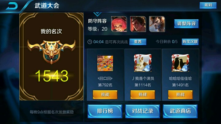 今天我发现武道大会一个套路,就是用安琪拉宫本吕布可以速度上排名,我们都知道现在吕布的大招跳起来的时候免疫伤害,当然对于我们宫本党来说还是比较喜欢宫本的大招~额⊙∀⊙!扯远了