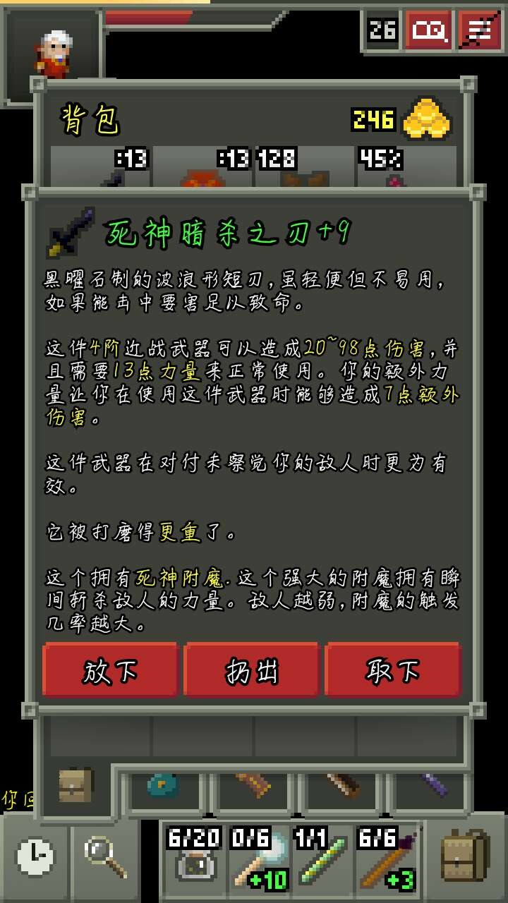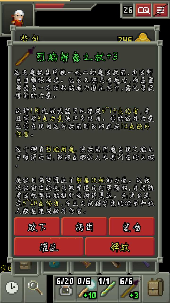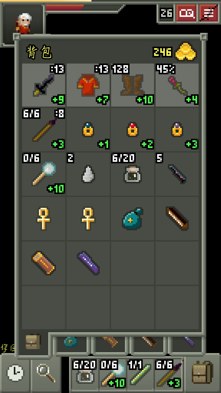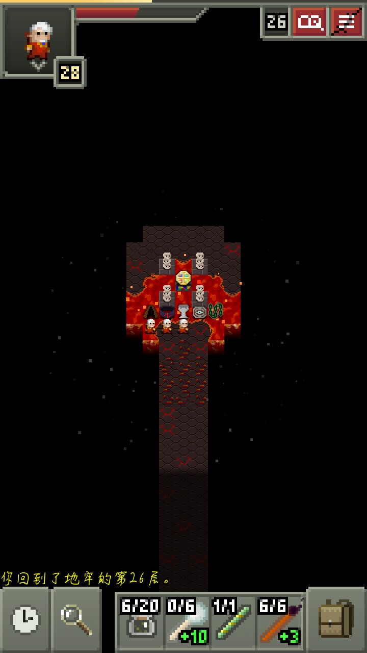 4 一些经验,法师开局有一把魔弹法杖,所以前期不需要像战士和盗贼一样要冲进去和怪你死磕(当然,中期后期也一样),也不要一直站在那里用法杖,一般就站在门那里往里面用法杖打一下或两下,然后就出门把门关上等怪开门(左下角有一个时钟,点一下等待一个回合,长按睡觉)再近战(冰杖建议用其它法杖引怪,打的时候再冰一下),前期怪的血薄,治疗药又没鉴定,阳春草也不一定有,这样可以省血。从22层开始就不建议把全层都刷一遍了因为怪太强,最好准备好探地卷轴再进(陷阱很多,有探地可以直接看下一层路口少跑路降低风险),尽量拿了升级卷轴和力量药水就跑,拿不到也不要强求,直接往下,最后的boss对于法师来说是比较简单的,麻痹,毒气,净化再近身打拳头(解离+灵视=地图炮就不讲了),然后慢慢用打眼睛就可以了。