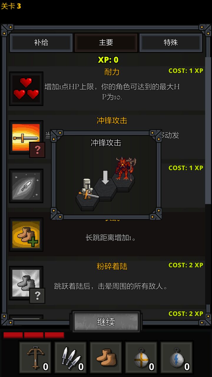 冲锋攻击:1,如果你的移动方向正前方有一个敌人,对它造成一点伤害。注意如果是侧面的敌人就不能触发