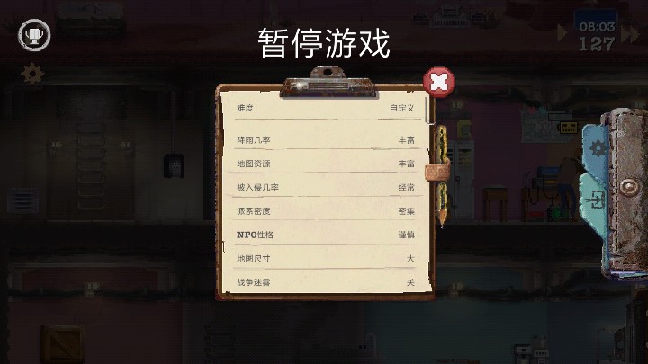 这是我选的难度,因为无数次被渴死,真的很憋屈,有时候好几天不下雨全家活活渴死。人物属性分配:我选择的是,学富五车,街头混混,麻烦不断,思维逻辑。街头混混和麻烦不断一个是感知度高可以在探索时发现更多物品,一个是很能打(保命要紧)。这俩我一直搭档探索,简直是绝代双骄学富五车是智力高,修建东西更拿手,而且后期的实验室需要智力10以上才可以操作。思维逻辑我就拿来打打下手,没啥用