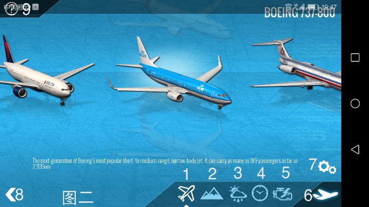 1.飞机仓库 2.地图 3.天气 4.时间 5.引擎设置 6.开始飞行 7.设置 8.返回 9.问题